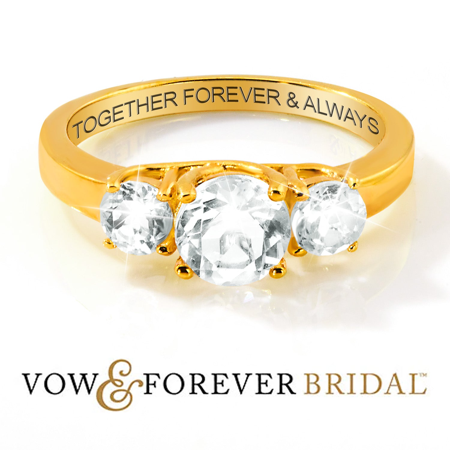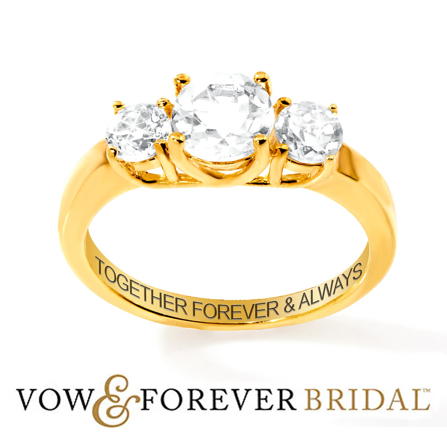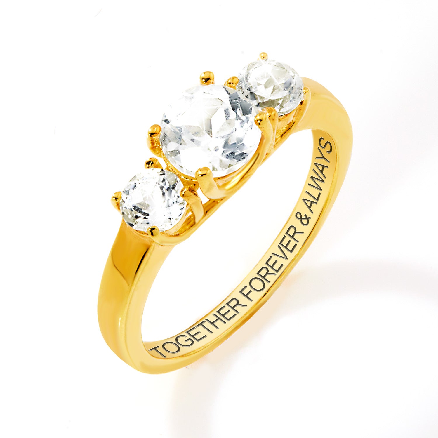 Say yes to affordable style with this genuine White Topaz wedding ring! From our Vow and Forever collection, this three stone design features White Topaz gemstones on a 14K Gold plated band. Make it your own with an engraved message along the inside of this gorgeous ring you'll love for a lifetime!