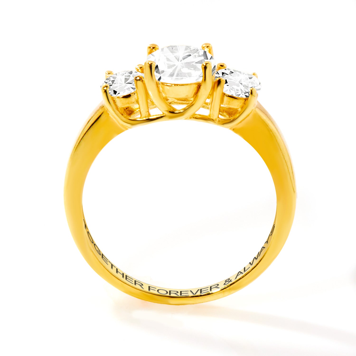 14K Gold over Sterling Brilliant White Topaz Three Stone Engraved Wedding Ring
