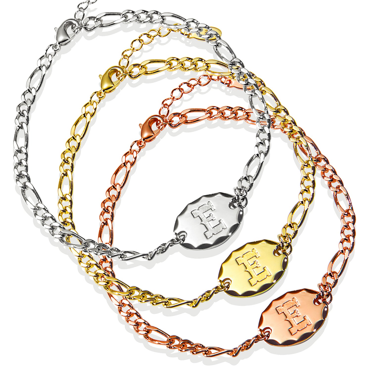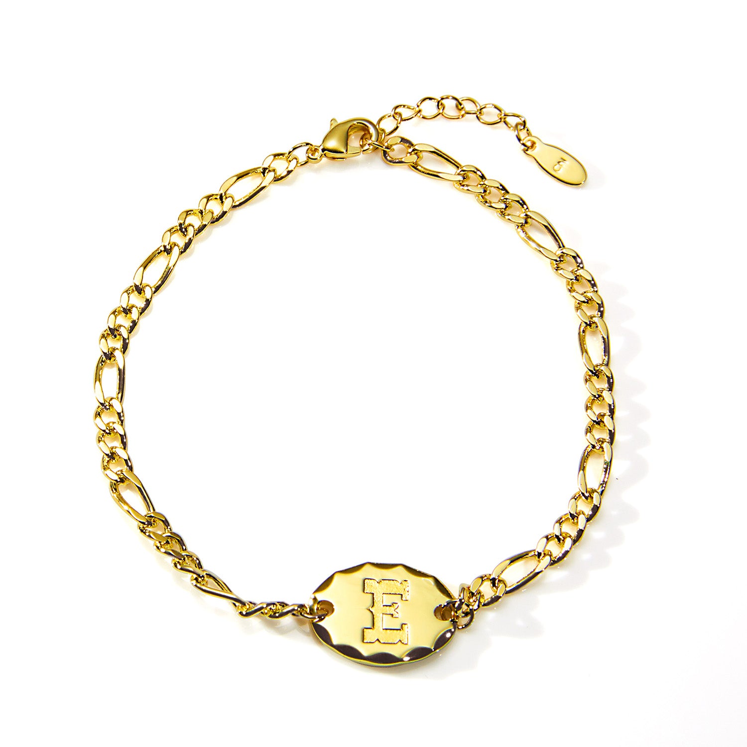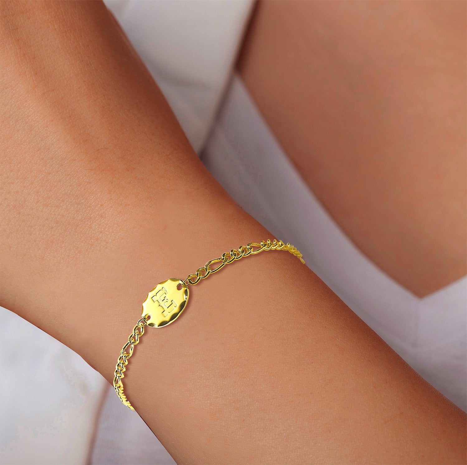 Classic with a western edge, this Engraved Oval Disc Station Figaro Chain Bracelet is a bold yet refined personalized piece you'll reach for every day. Featuring a diamond-cut oval station engraved with a single uppercase initial in a western-style font, this bracelet blends timeless design with rugged character. The sleek 3+1 Figaro chain adds texture and strength while keeping the look polished and wearable.