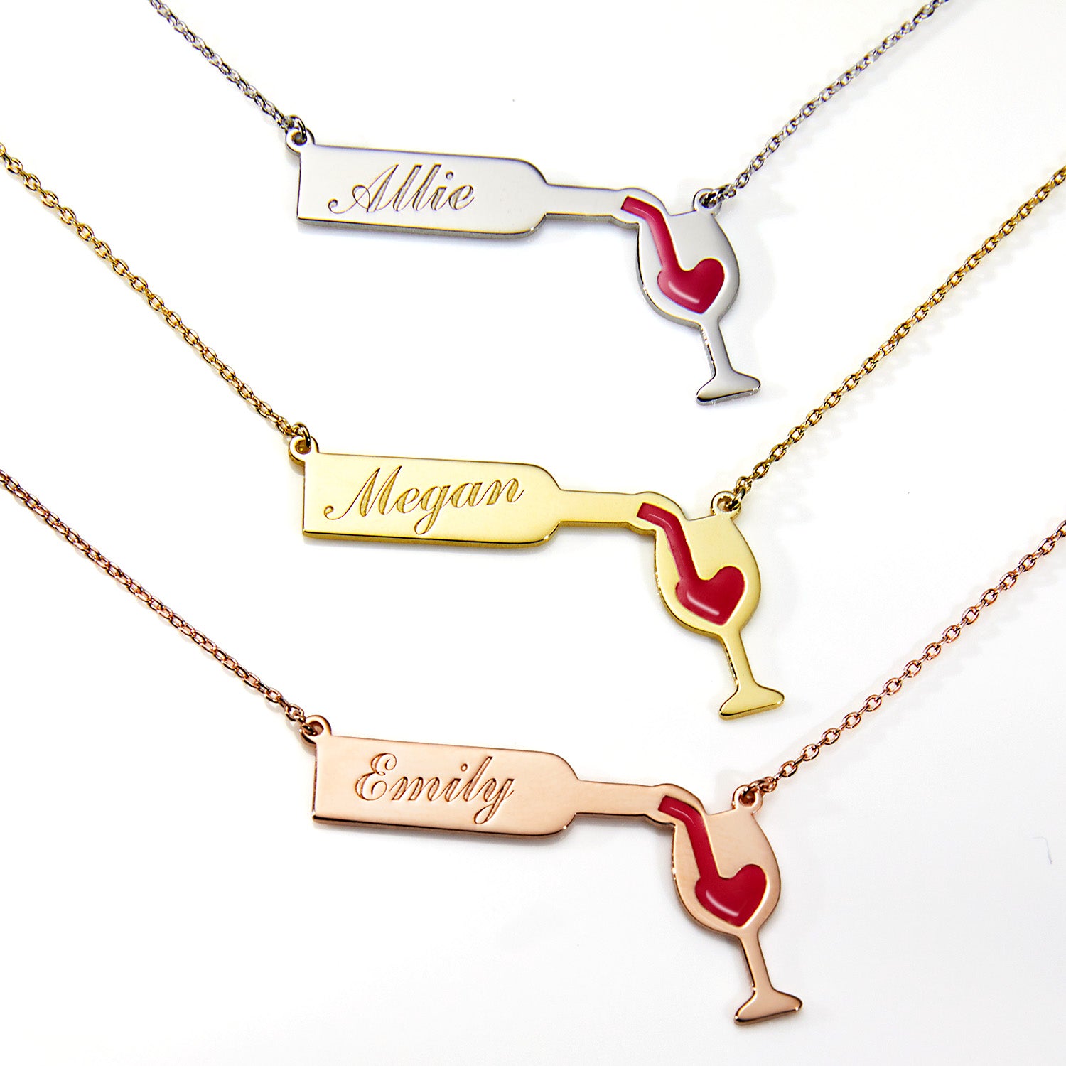 Available in silver, gold, or rose gold plating, this unique plaque-style necklace makes a thoughtful gift for wine lovers or a fun everyday accessory with personality.
