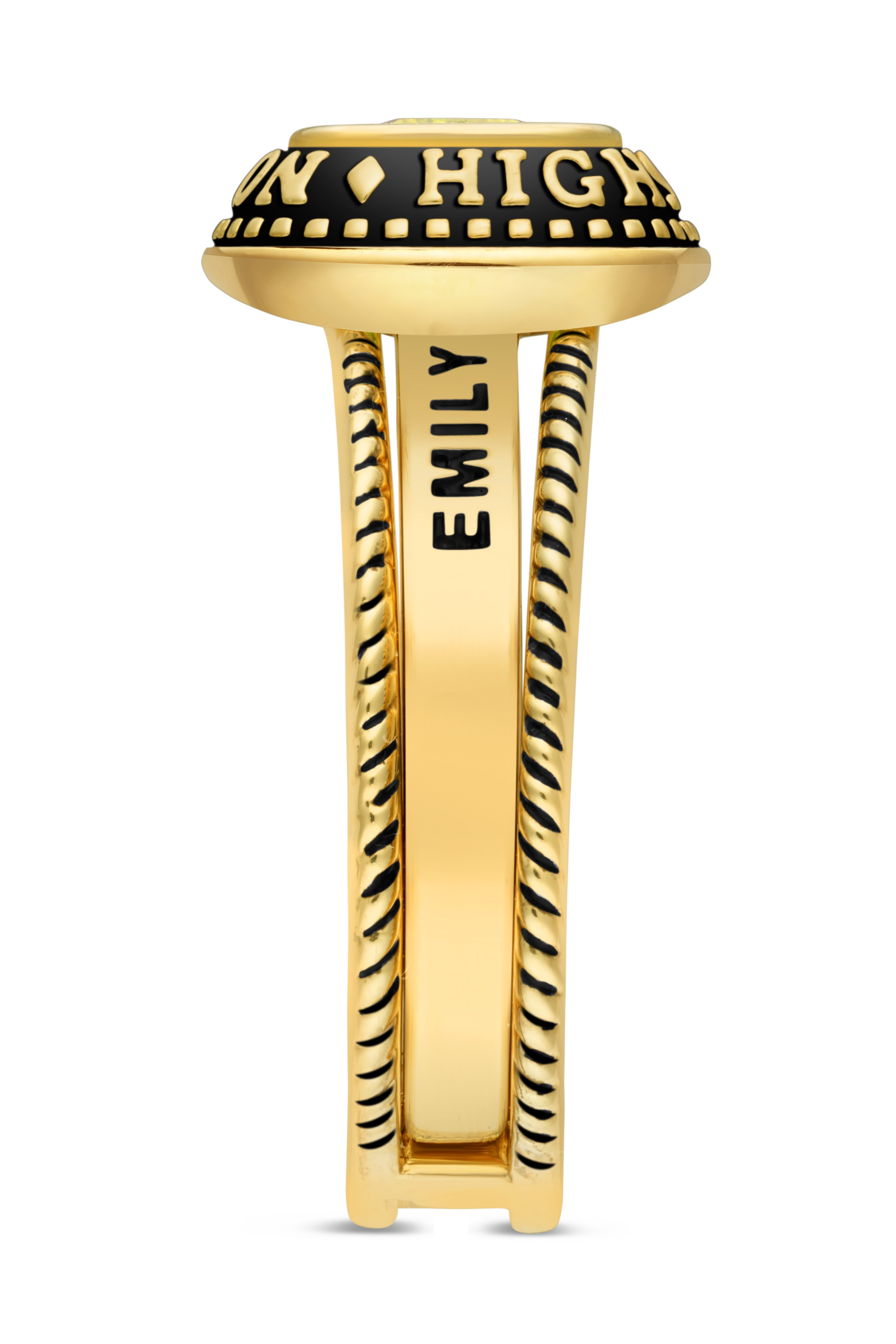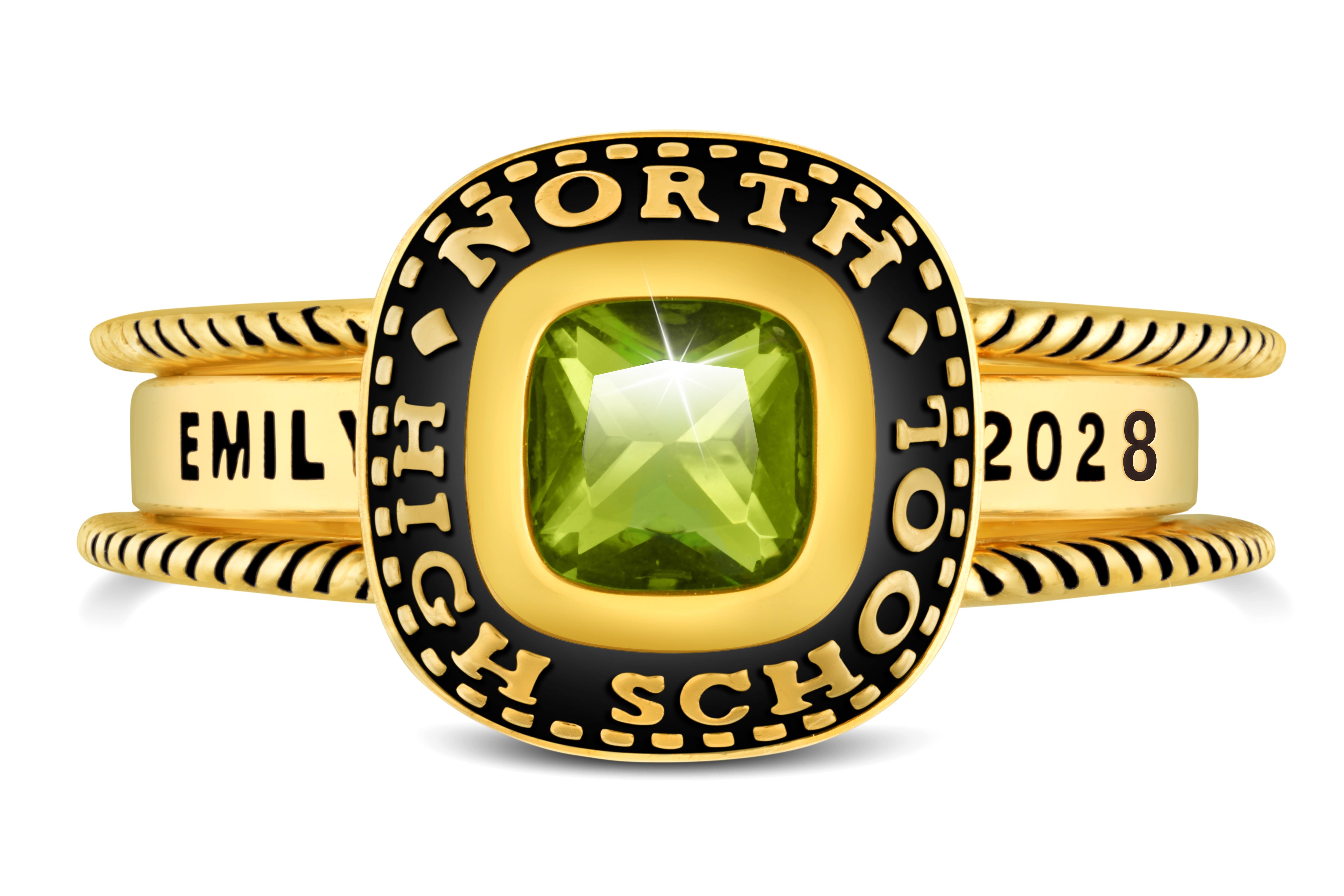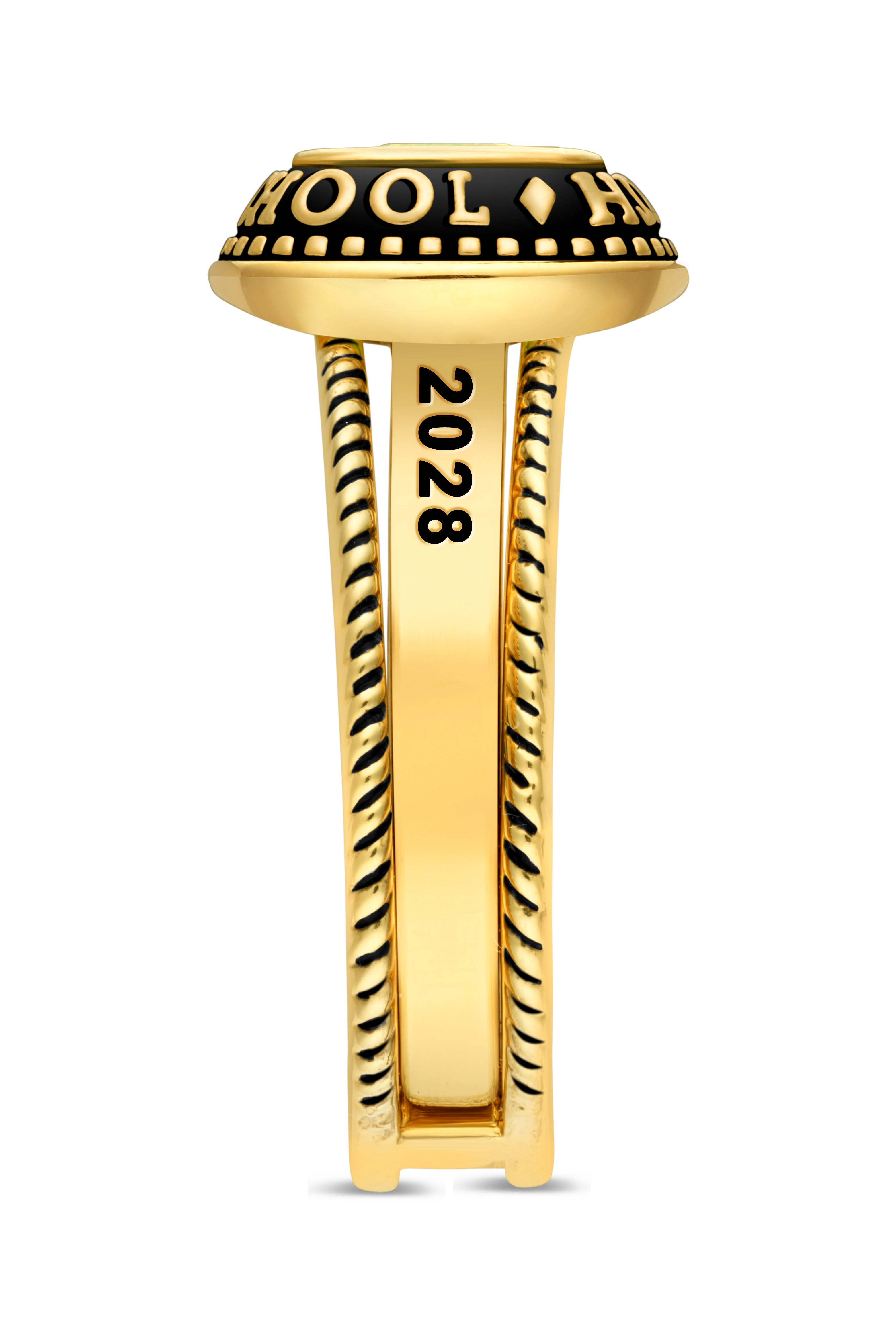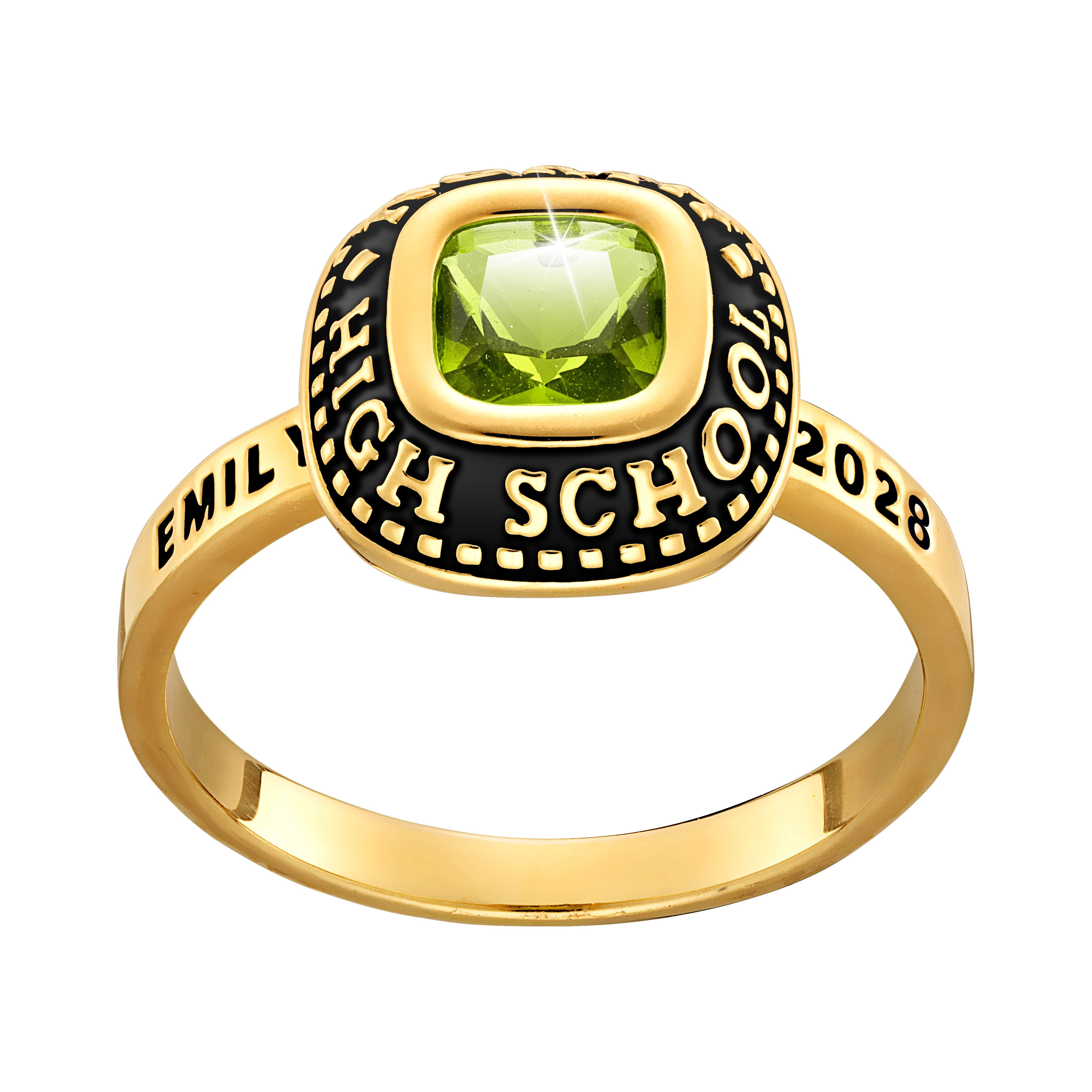 Surprise a special student with this beautiful gold plated class ring! This design includes a jacket and numerous ways to customize. Select a center stone, and add her school name and graduation year. You can even engrave a personal message on the inside. This thoughtful gift will remain a keepsake long after her school days are over.