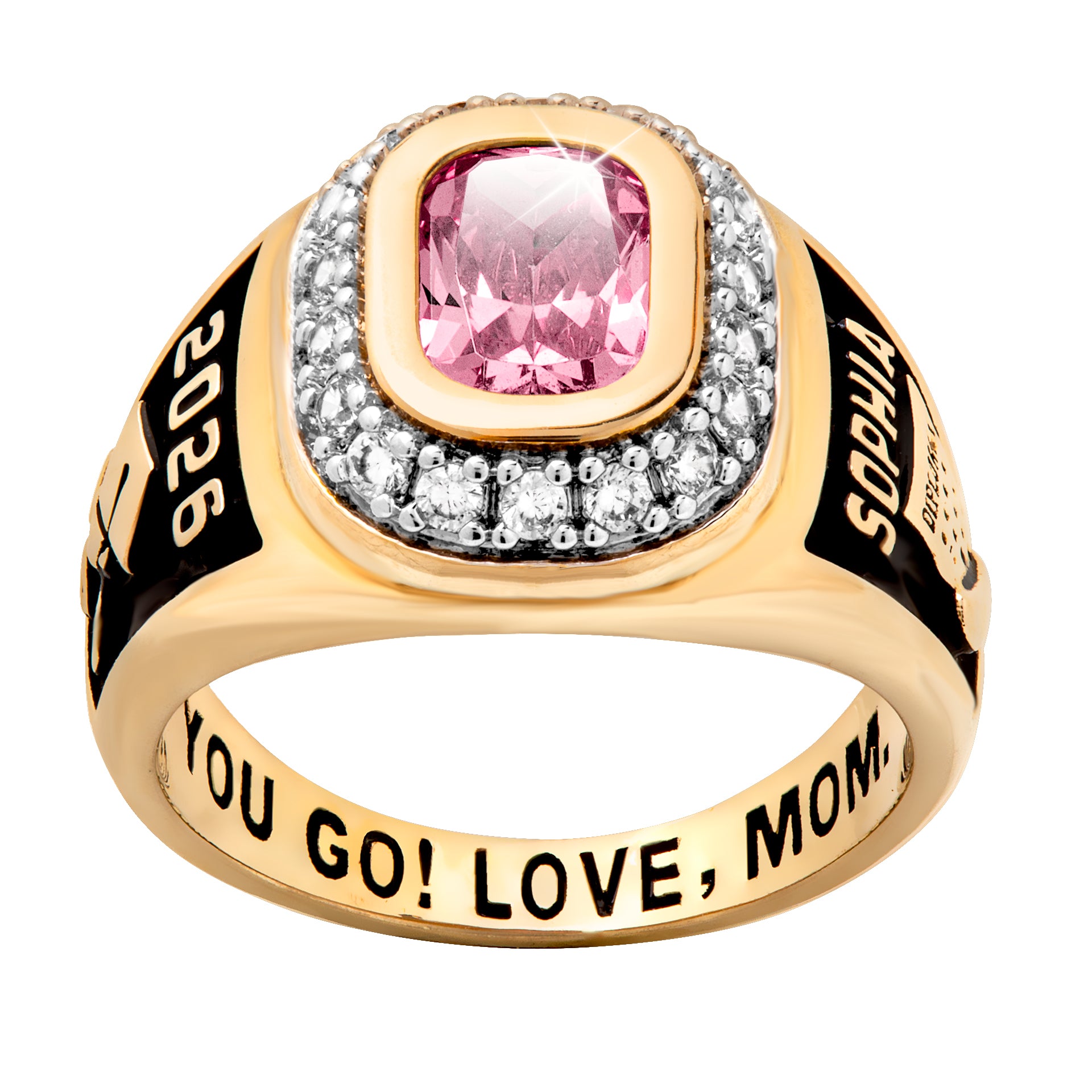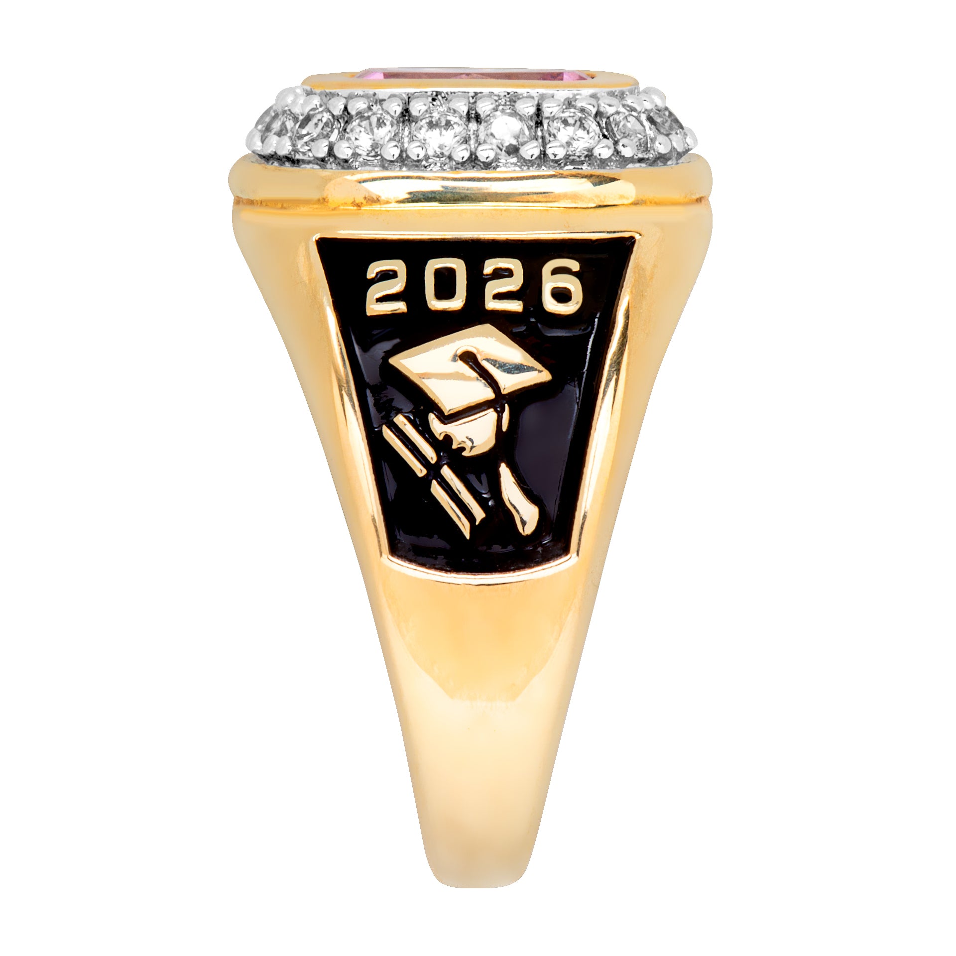 Surprise your graduate with this gorgeous class ring! CZ accents surround a center birthstone on this 14K Gold plated design. Side graphics feature a graduation cap and rolled diploma and an open diploma. Enhance the side images of this this stylish ring with her name, class year or other personalization and add a special message along the inside band to create a memento from her school days she will treasure.