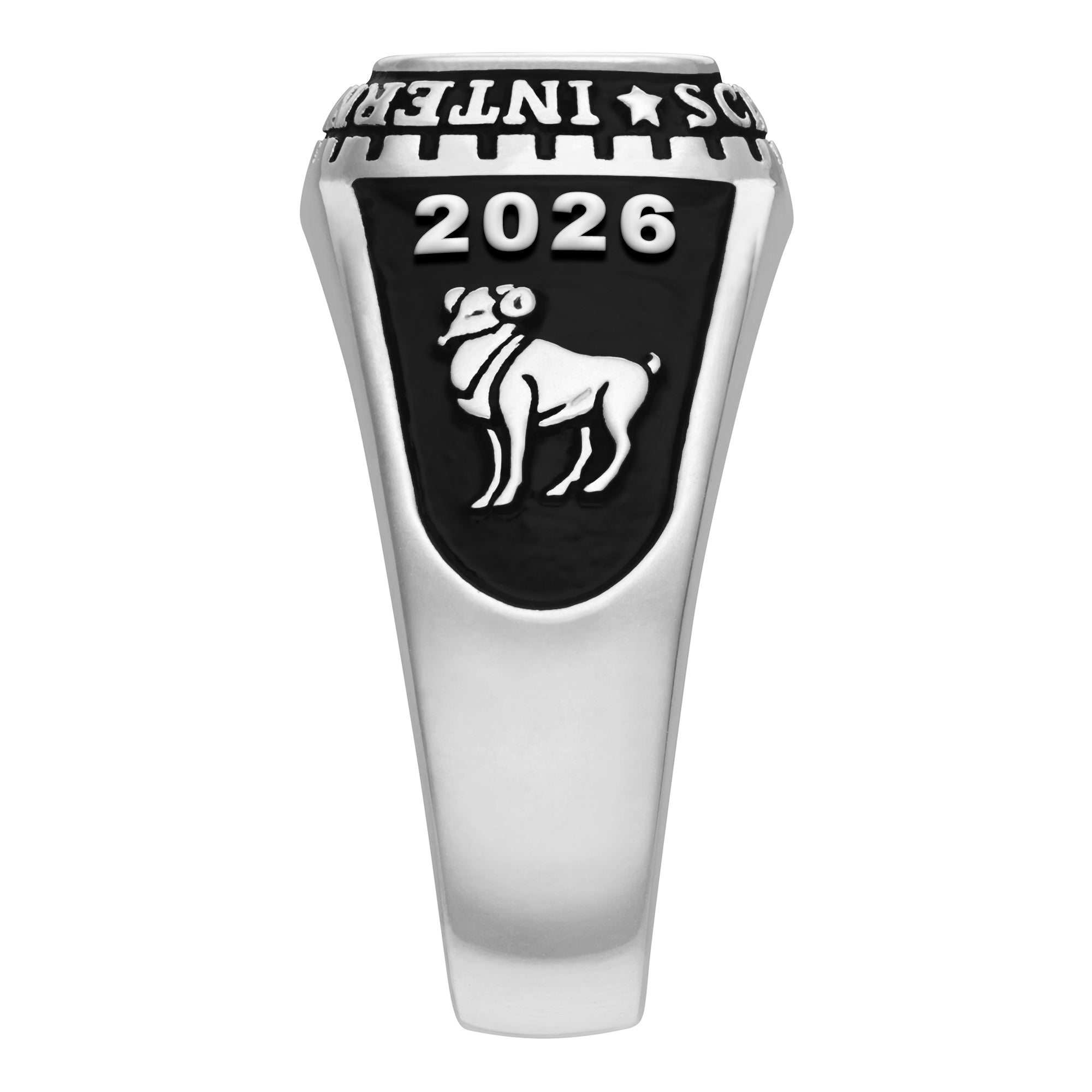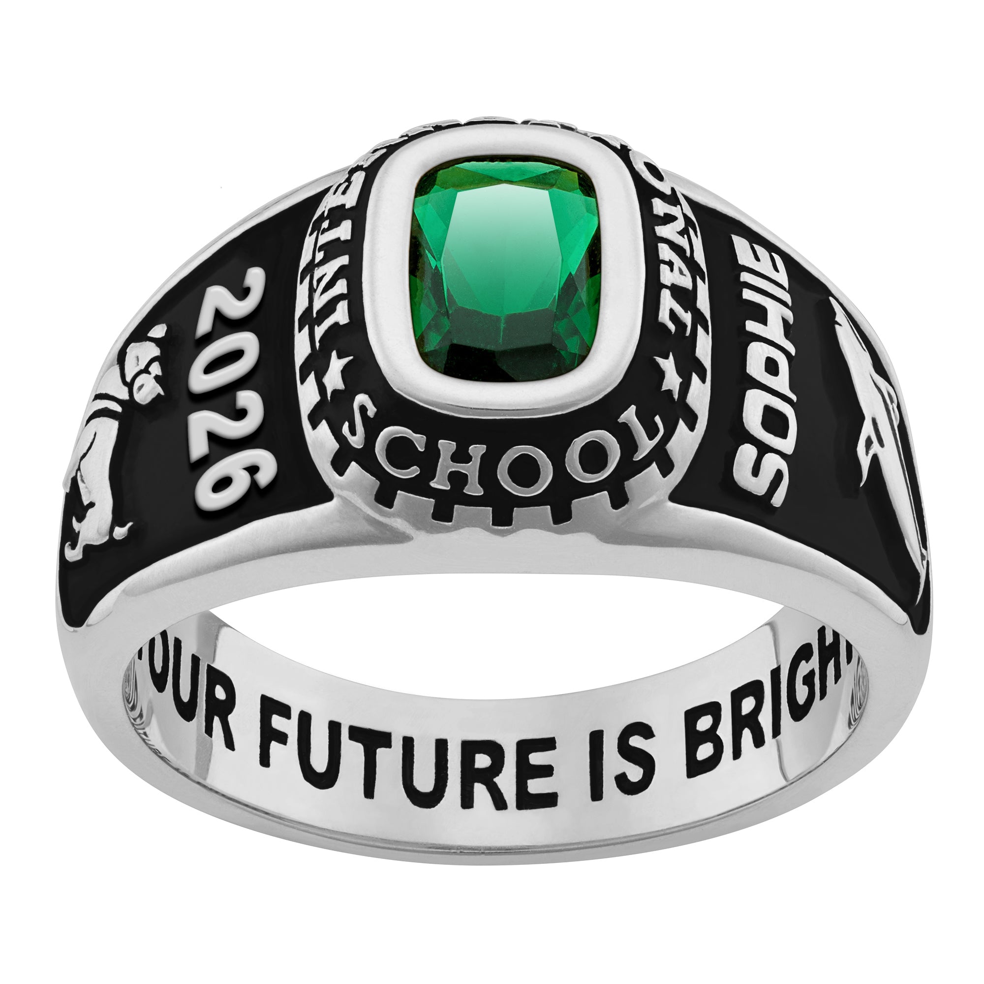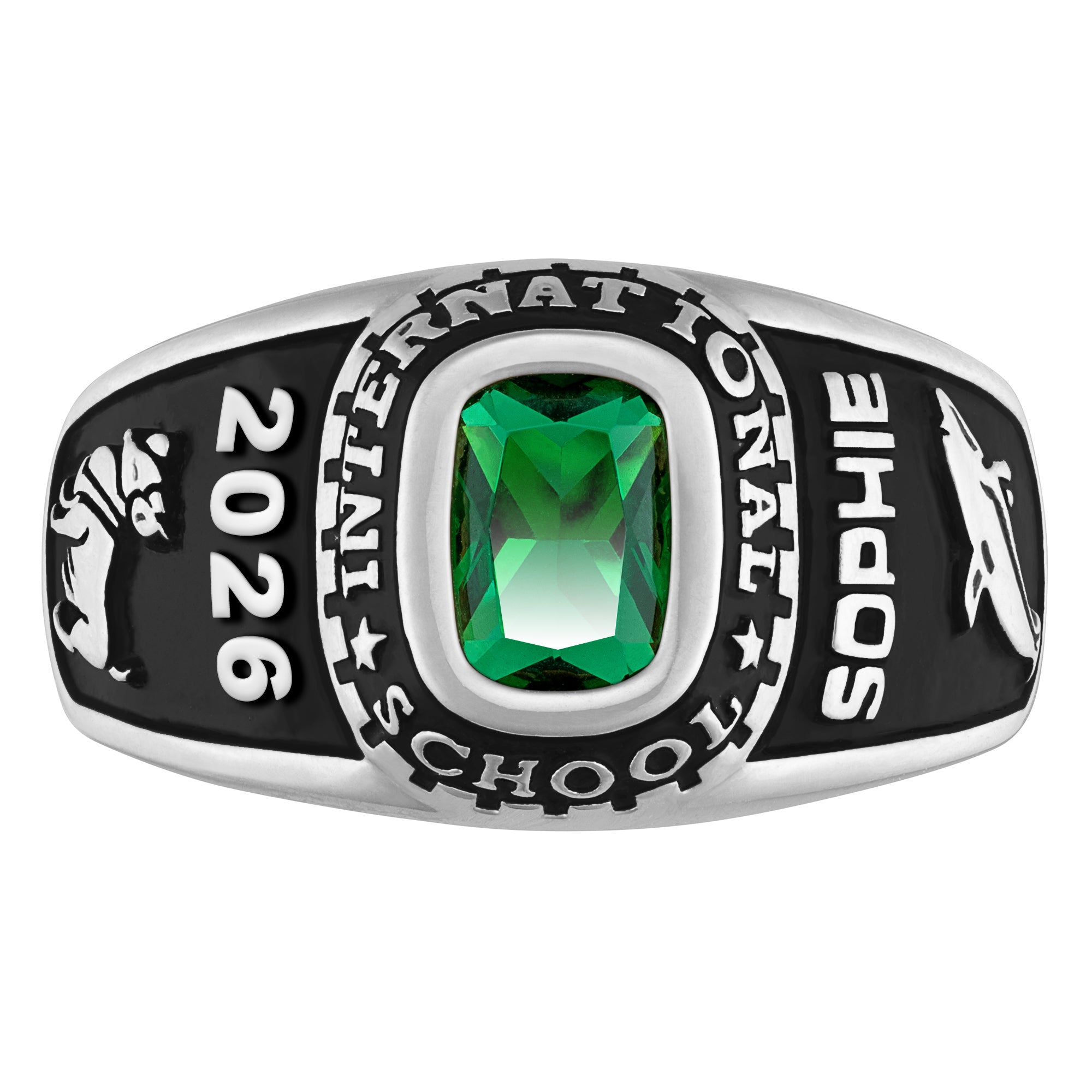 Like a chic strand of pearls, this birthstone class ring is always on the jewelry honor roll. Beautifully crafted in luminous CELEBRIUM to resist tarnish, the ring is fully personalized and engraved with an endearment inside. Featuring raised polished lettering and an antique finish.Specify school name or motto for top (up to 22 letters), up to 7 letters or numbers at left, up to 7 letters or numbers at right, 2 activity images and 6x8 mm rectangular birthstone or school color (1 stone choice). Engrave inside up to 18 letters & spaces.Limoges Jewelry is proud to offer CELEBRIUM -- an innovative, affordable metal alloy noted for its lasting shine and durability.