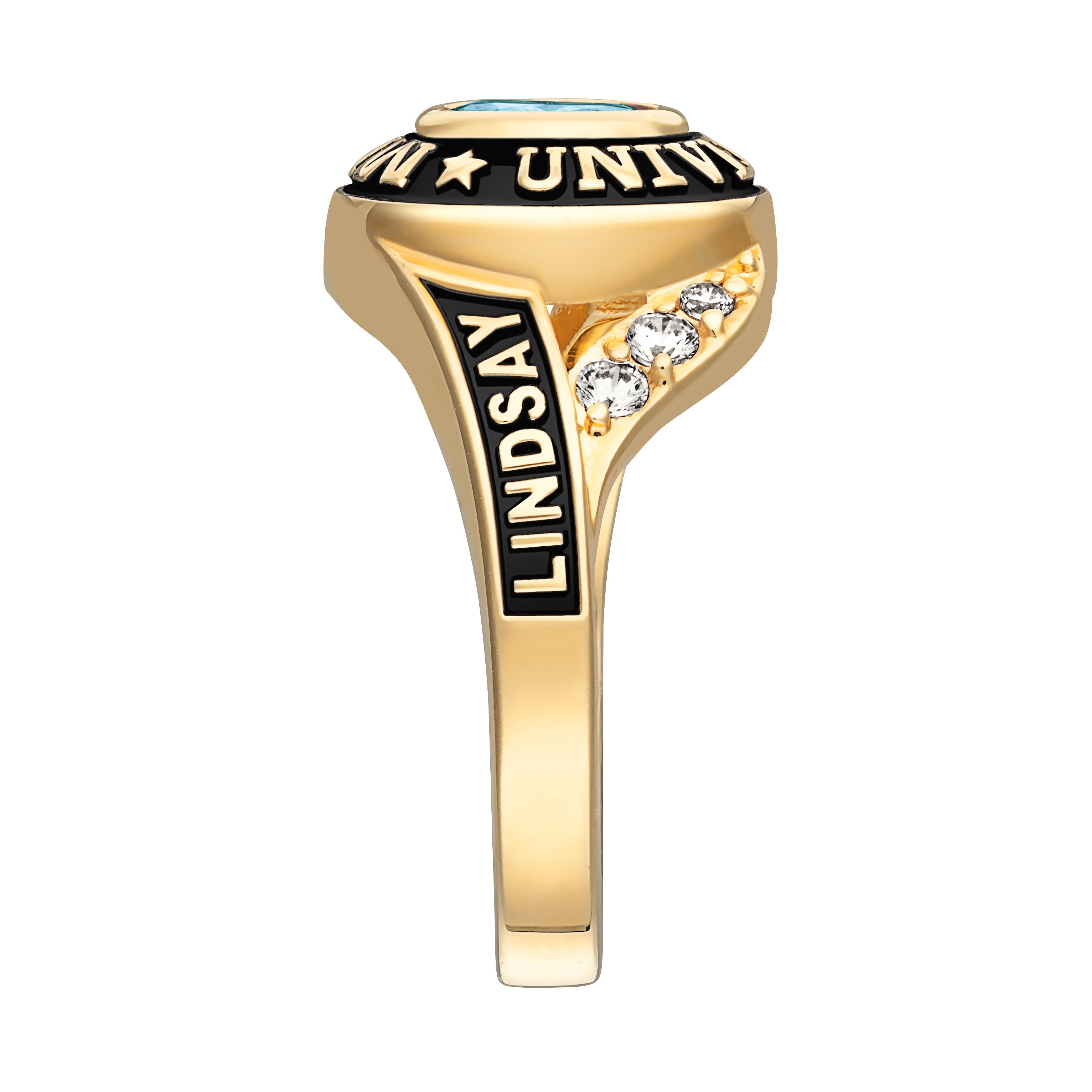 Stylish and unique, this striking design features a radiant oval birthstone center with a school name elegantly wrapped around the gem. Personalize the sides with a name, graduating year or however you desire to create the perfect graduating keepsake!