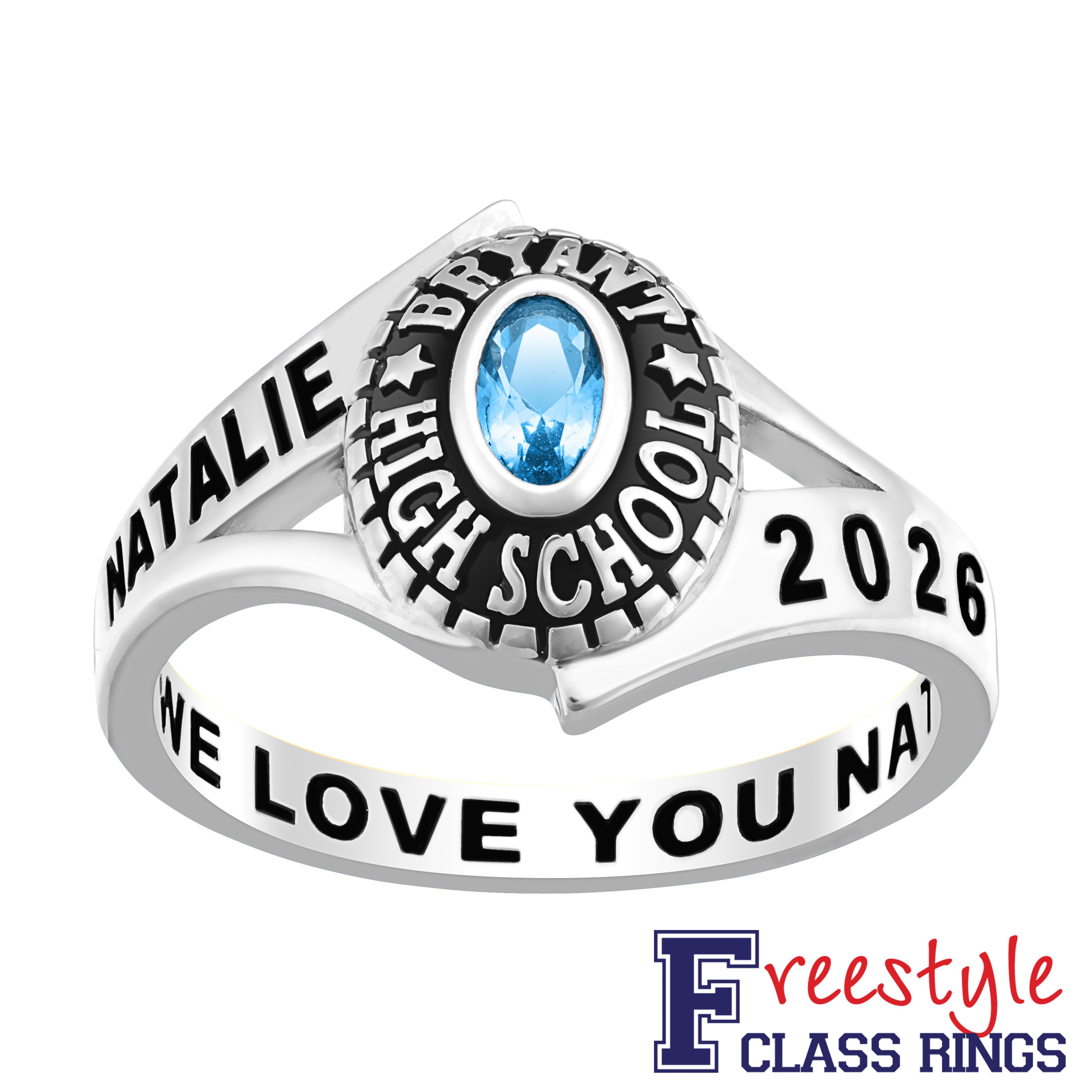 Plated in Platinum for added durability and sheen, this dazzling design features a brilliant oval birthstone center with a school name elegantly wrapped around the gem. Personalize the sides with a name, graduating year or however you desire. Makes a one-of-a-kind keepsake, perfect for celebrating academic success!