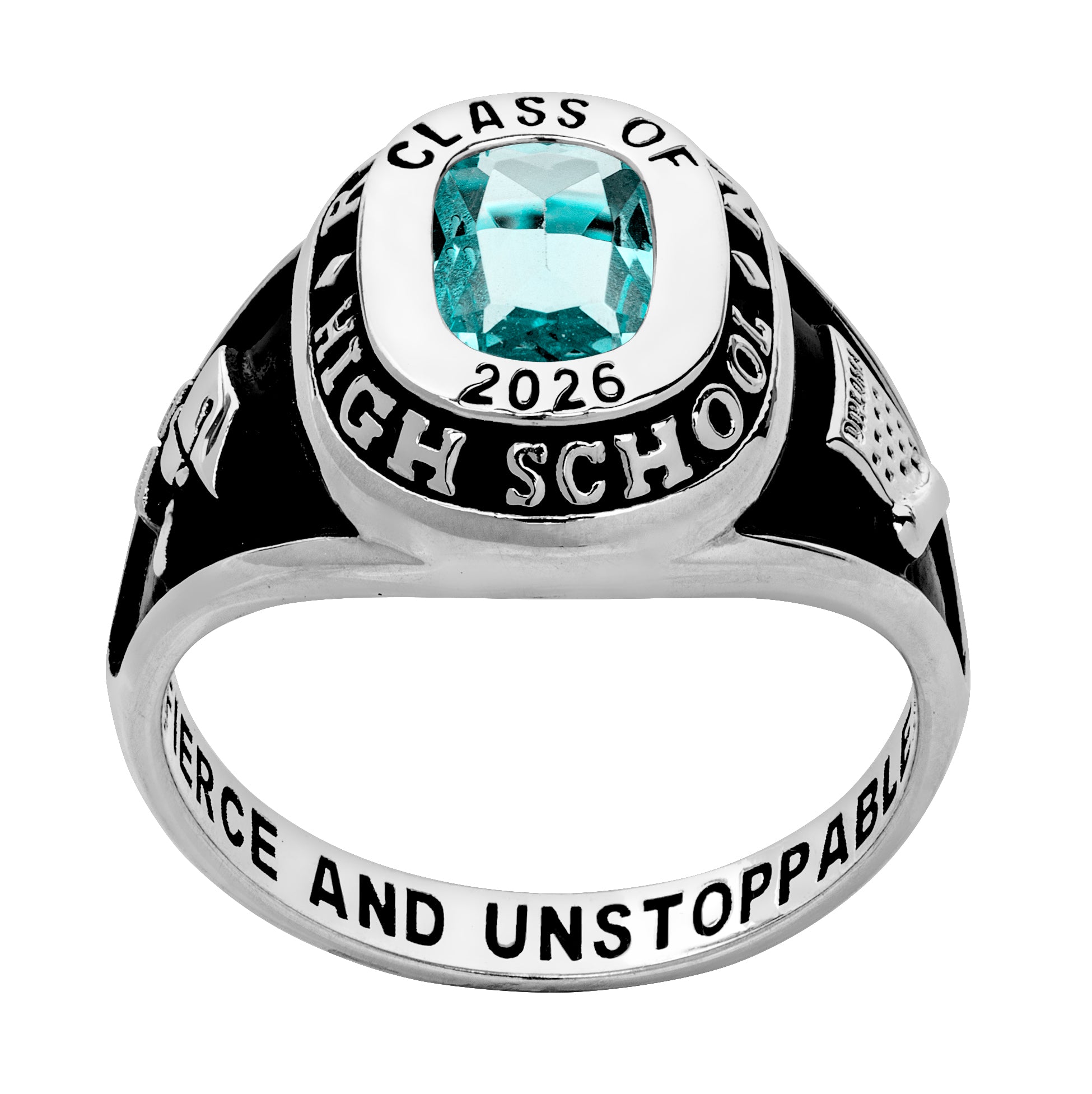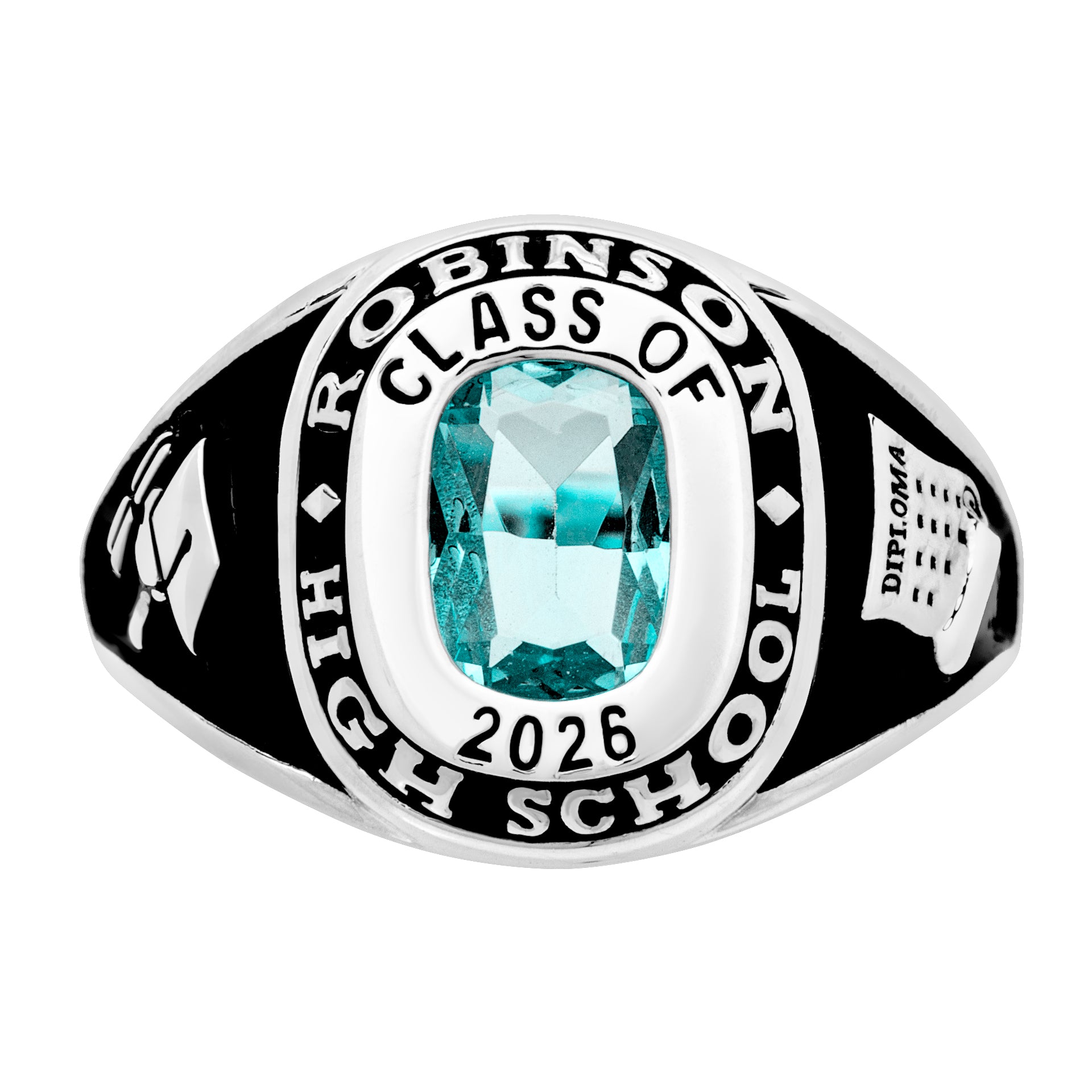 Don't graduate without your class ring! This Platinum plated traditional design showcases a lovely center birthstone with space for customization above and below. Add your school name, graduation year and even a special message along the inside band. Side graphics feature a graduation cap and rolled diploma on the left and an open diploma on the right. Years from now you will be glad that you have this memento from your high school days.