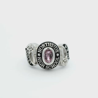 Dazzle her with this sweetheart of a class ring which features Genuine Diamond accents! Beautifully crafted in warm Rose Gold CELEBRIUM, ring is set with a sparkling oval birthstone. Diamond accents sparkle brilliantly within the flower design against an and polished finish. Specify birthstone or school color stone and school name for the top (22 characters including spaces). Personalize left and right sides with up to 7 characters on each side. Add a special message on the inside of ring, up to 15 characters including spaces.Limoges Jewelry is proud to offer CELEBRIUM -- an innovative, affordable metal alloy noted for its lasting shine and durability.