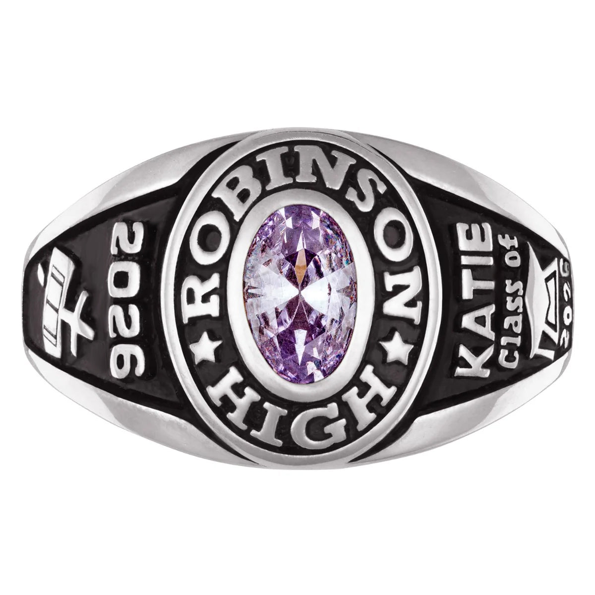 For the scholar with a wonderful fashion sense, this petite class ring is filled with special personalization. Crafted with Rhodium plating to resist tarnish, the ring features a bezel-set birthstone to add a pop of color in the traditional design. Individually personalized with raised polished lettering and an enameled finish.Specify birthstone or school color stone (4 x 6 mm oval), and school name up to 11 characters around the top of the stone and 11 characters around the bottom (22 characters total). Choose from 8 characters for graduation date on left side, and up to 8 characters for name on right side. Choose 2 activity images, 1 per side panel. Inscribe the inside of the band with a personalized message, up to 18 letters and spaces.