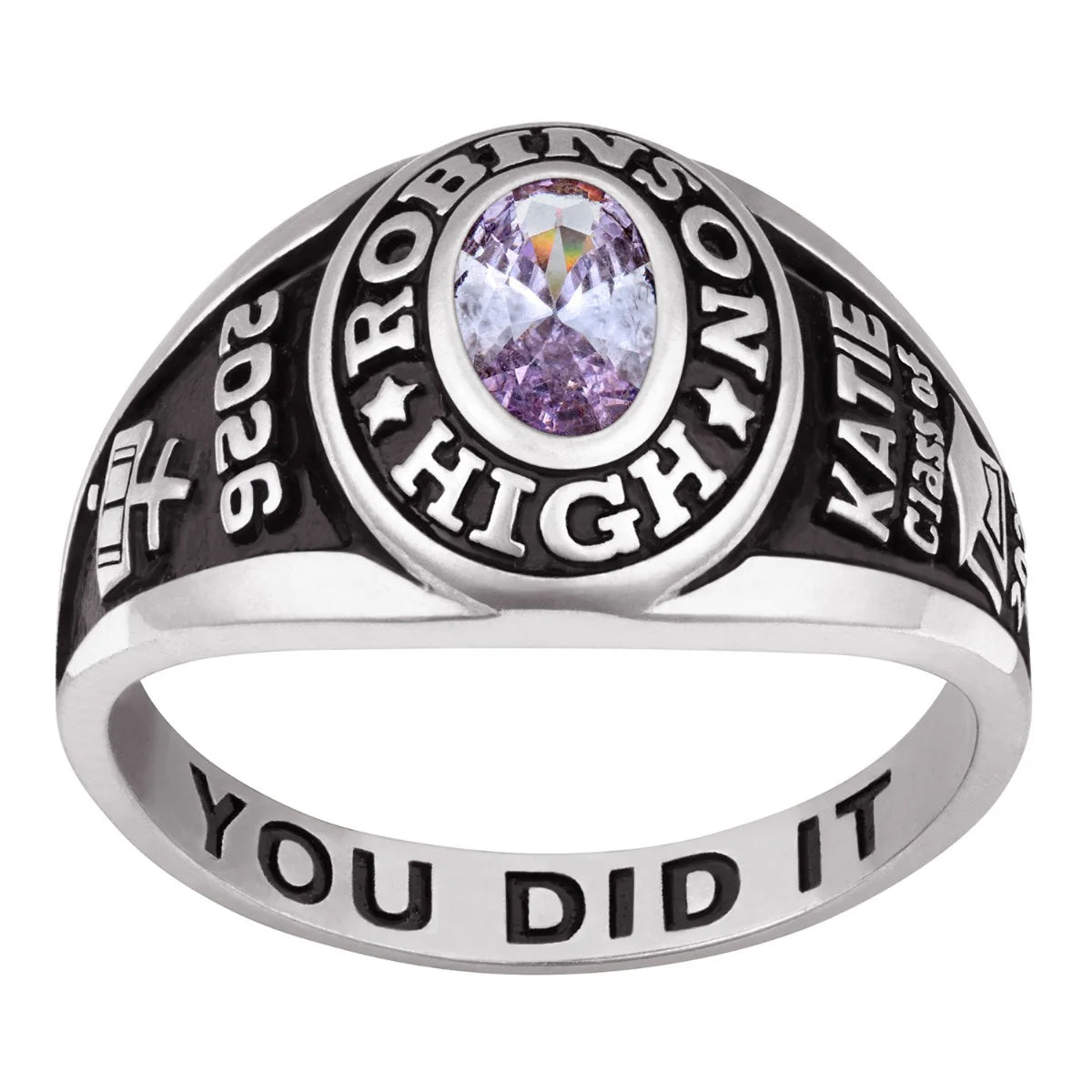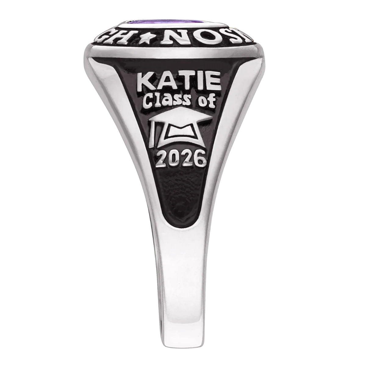 - This handcrafted personalized class ring is designed to capture your school pride and graduation story. Choose your school name, graduation year, birthstone, and add a personal engraving inside or outside the band.
