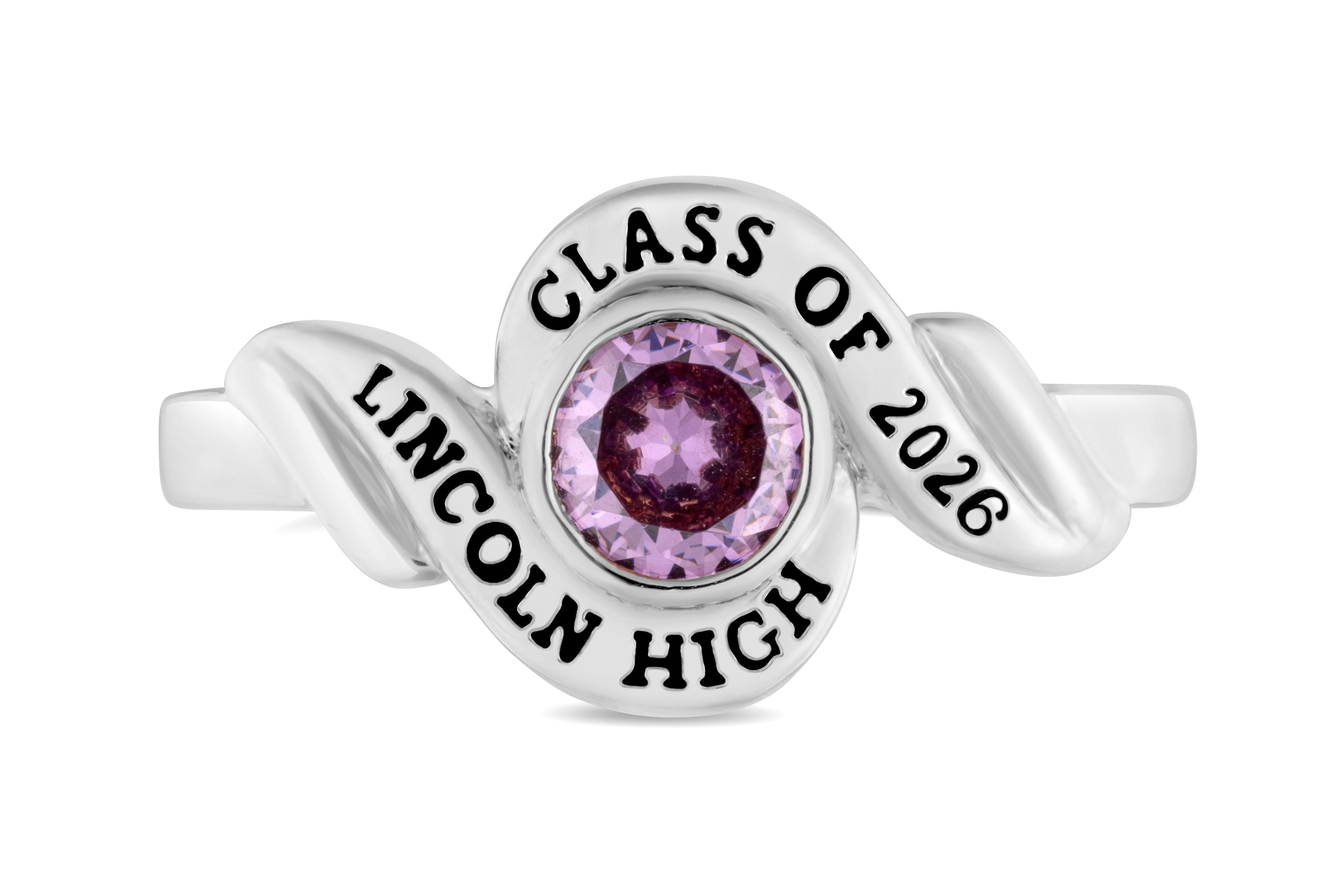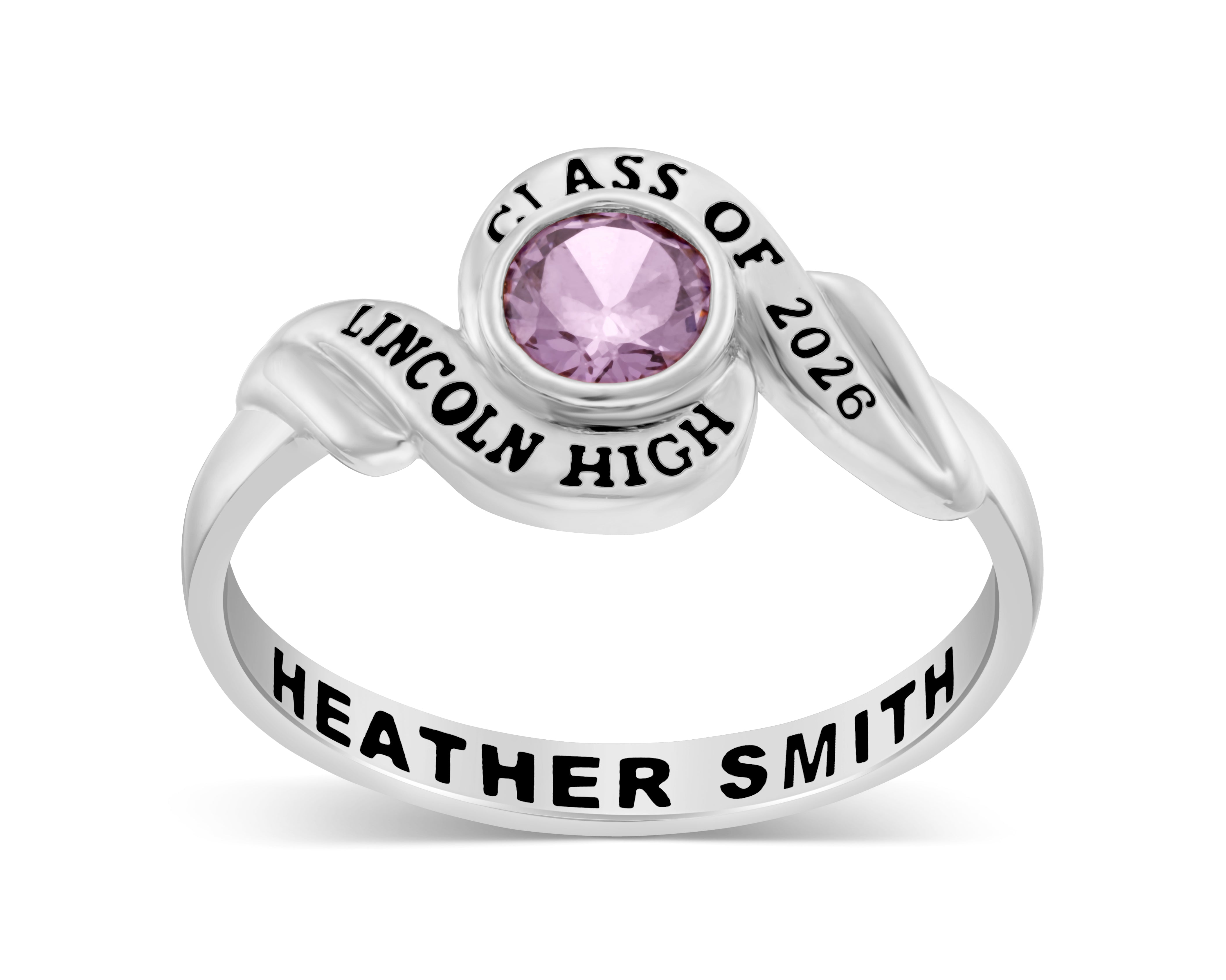 Celebrate your stylish grad with this charming Sterling Silver swirl design class ring. Choose her birth month, school color or favorite hue for the round center stone and add her school name and class year to surrounding swirls. You can even engrave a personal message of congratulations along the inside band. This special gift will become an heirloom she'll treasure for a lifetime.