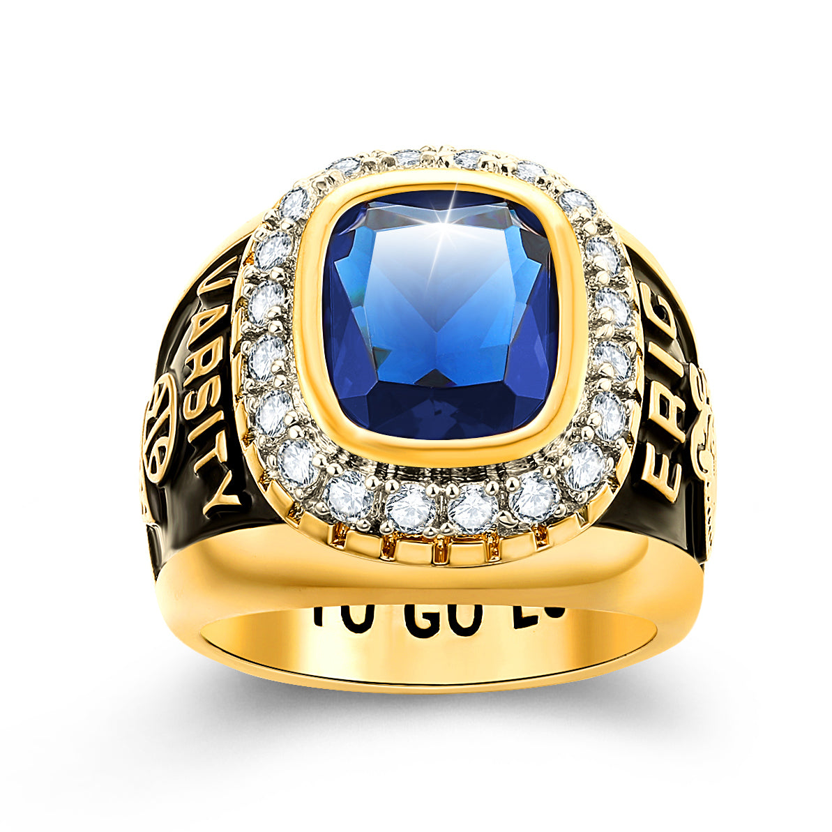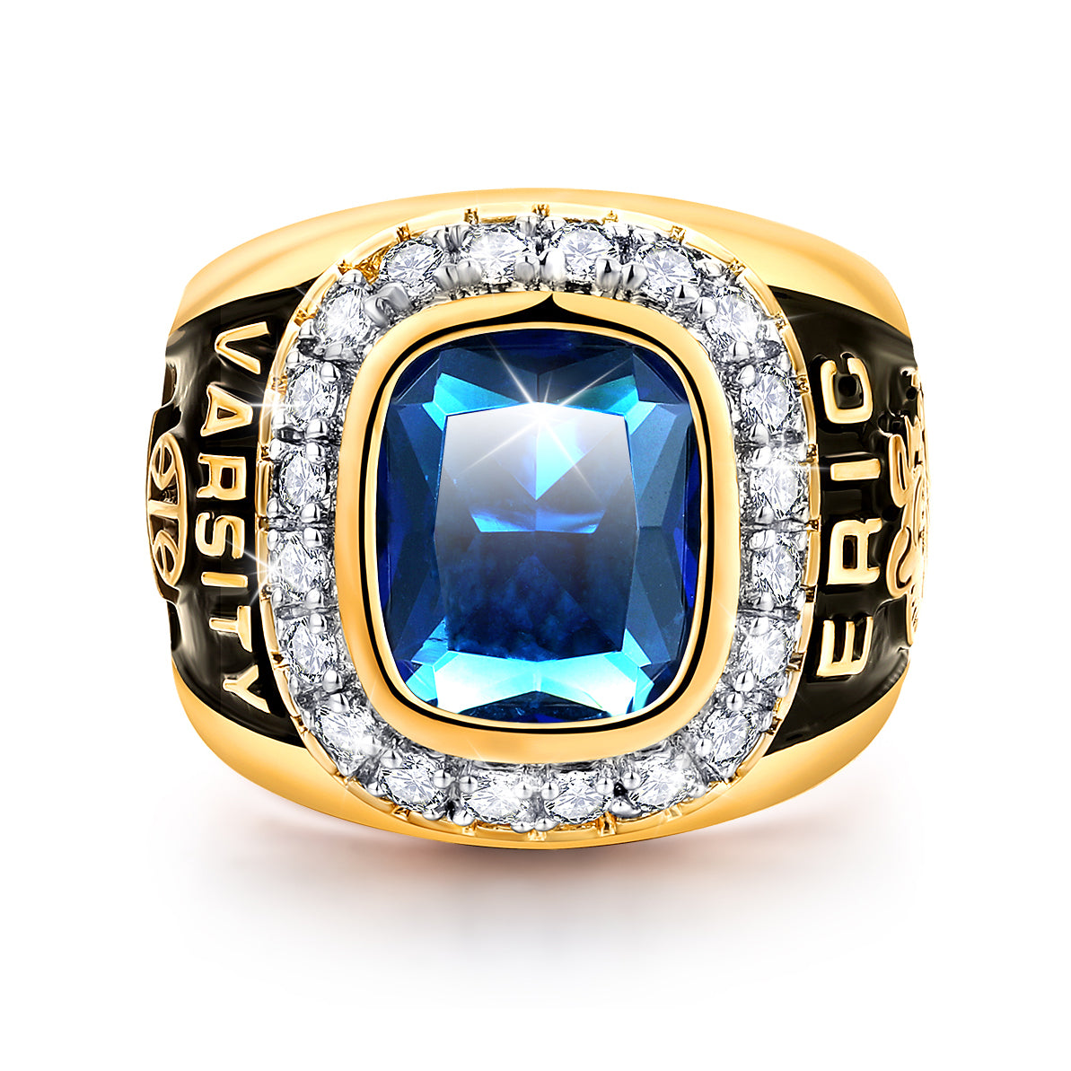 Rock this blinged out class ring like a champ! Our championship design showcases a brilliant center birthstone surrounded by dazzling CZs for a superstar look. Customize the sides with your personal stats, sports and clubs to make this stunning 14K Gold plated ring your own!