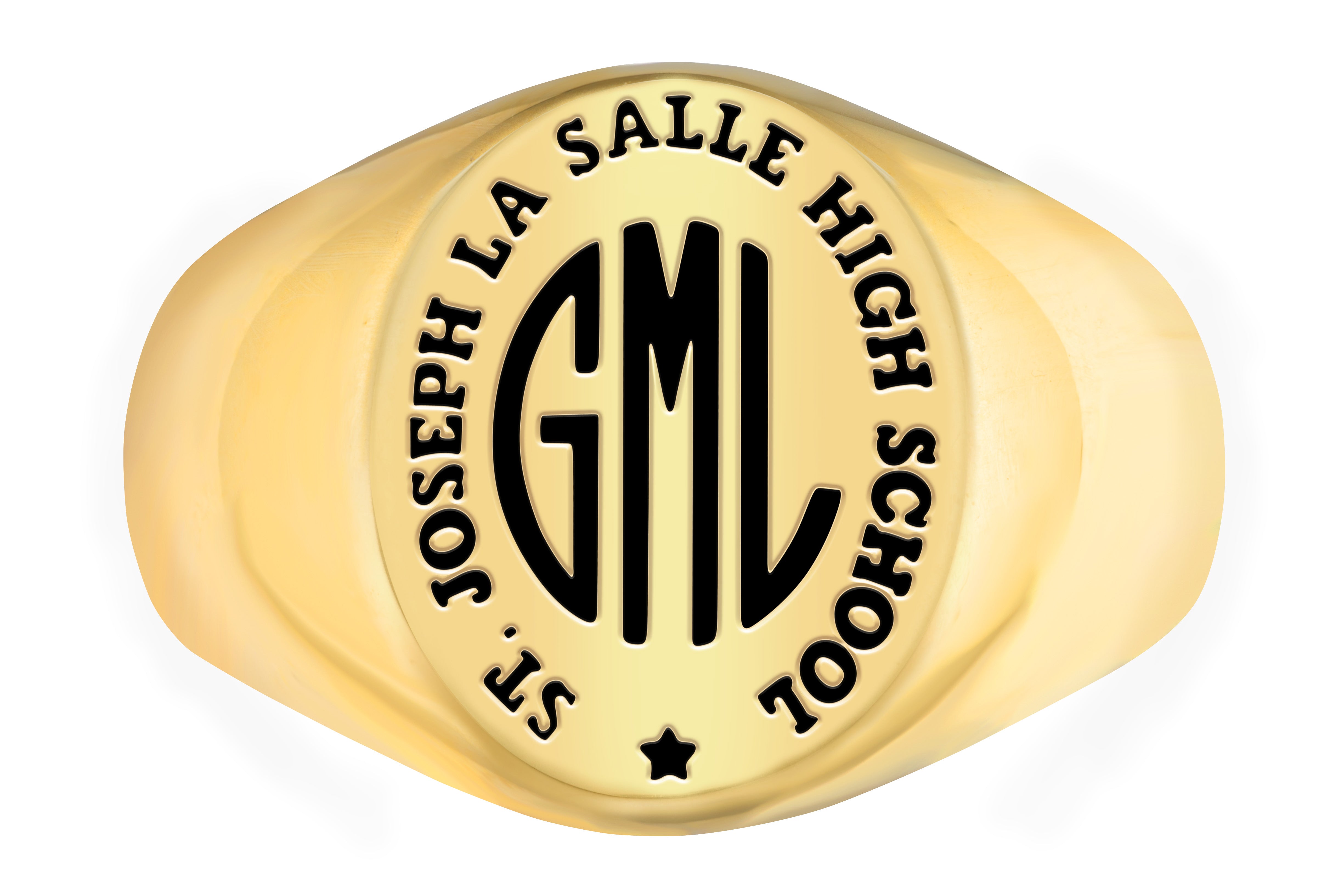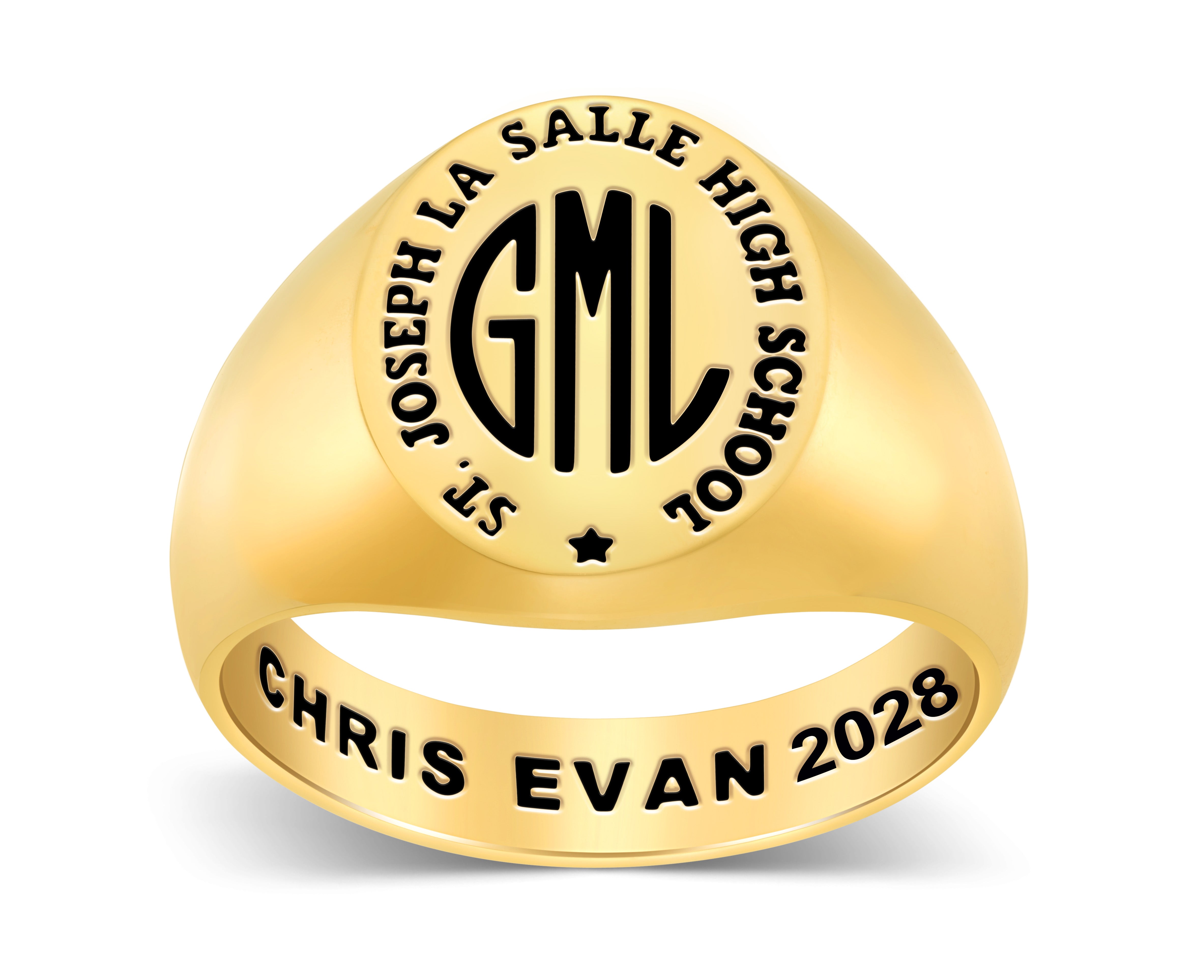Commemorate your high school years with this stylish monogram class ring! The gold plated signet design with simply your initials, school name and class year provides a clean, masculine look.  Your full name or other message can be engraved inside.