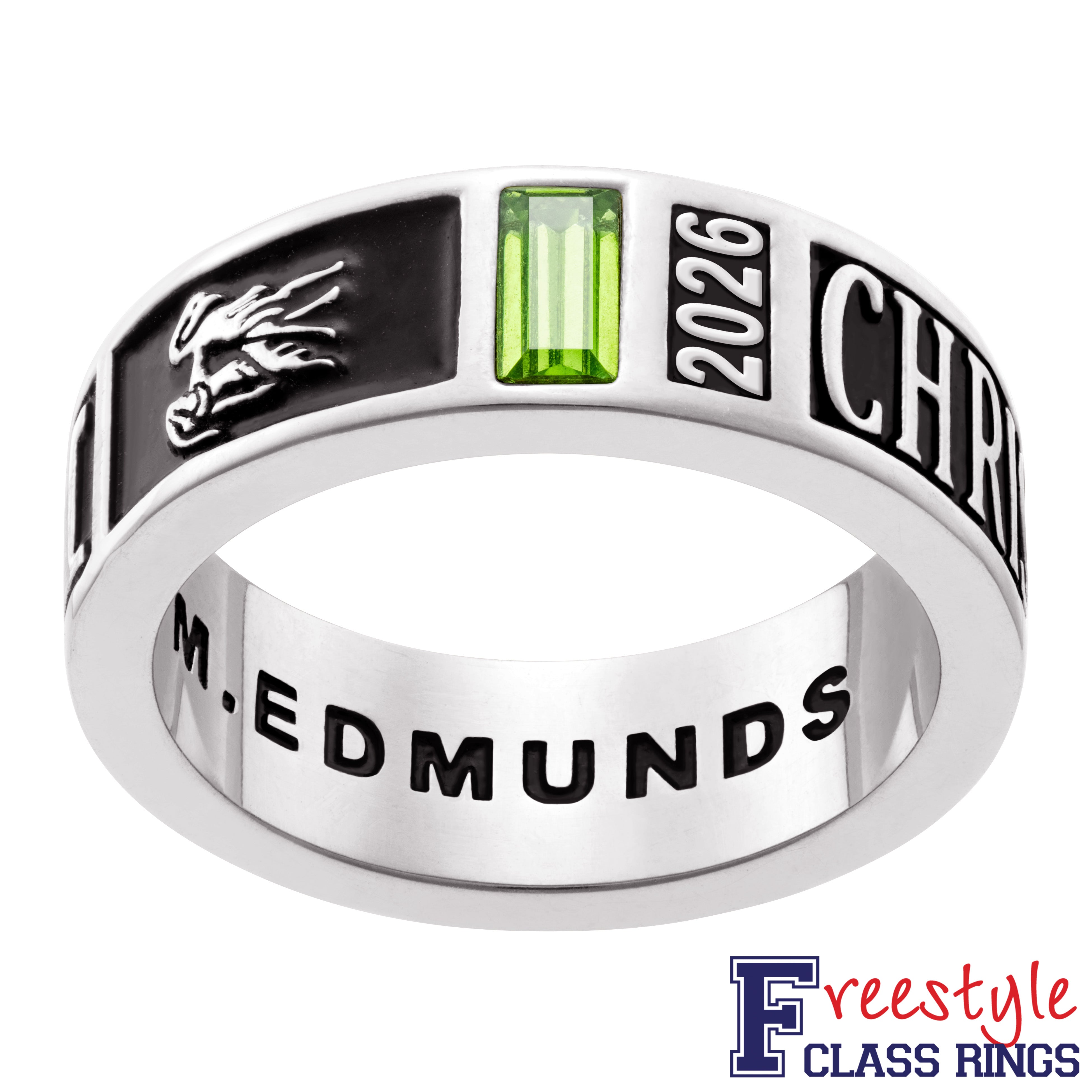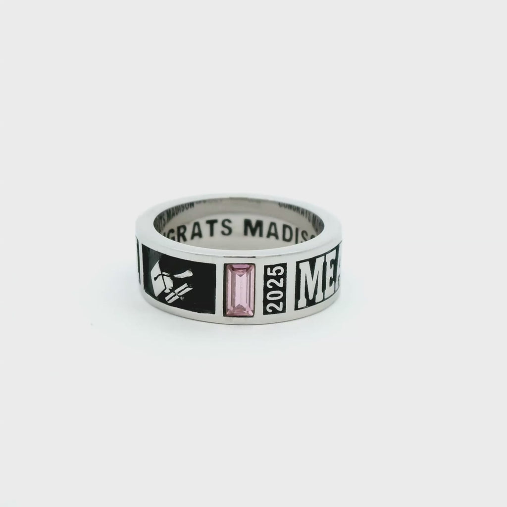 Enhance his graduation experience with this customizable class ring! Showcasing a bold design he is sure to love, this school ring is perfect for boasting school pride and academic success. Features space along the top to personalize with a pair of brilliant birthstones, a name, an initial, school year, and a graphic representing a favorite extracurricular activity, sport, or any desired icon. Includes all of the flair of a traditional class ring on a band. On the inside of the band is space to add an engraved message of love, full name, or any desired text. Create a remarkable memento when you personalize this outstanding design inside and out!
