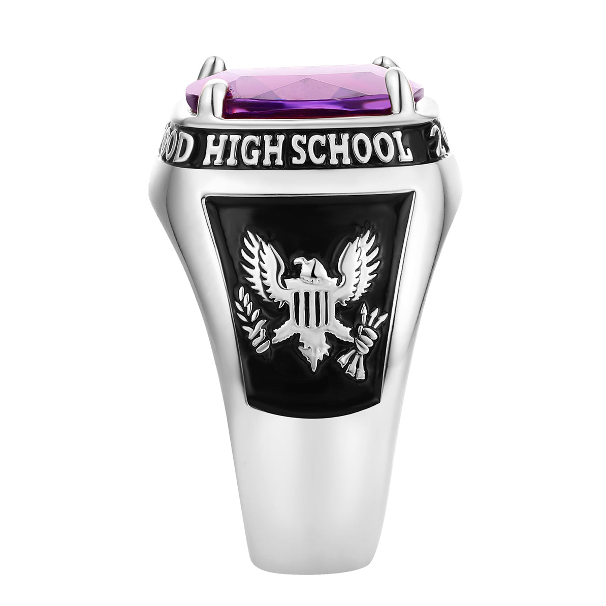 You can't go wrong with a classic! This traditional class ring showcases a brilliant prong set birthstone surrounded by your personal stats like school name and graduation date. This Silver plated school ring is sure to be a treasured keepsake that you will wear for years. Makes a spectacular gift for a special graduate.