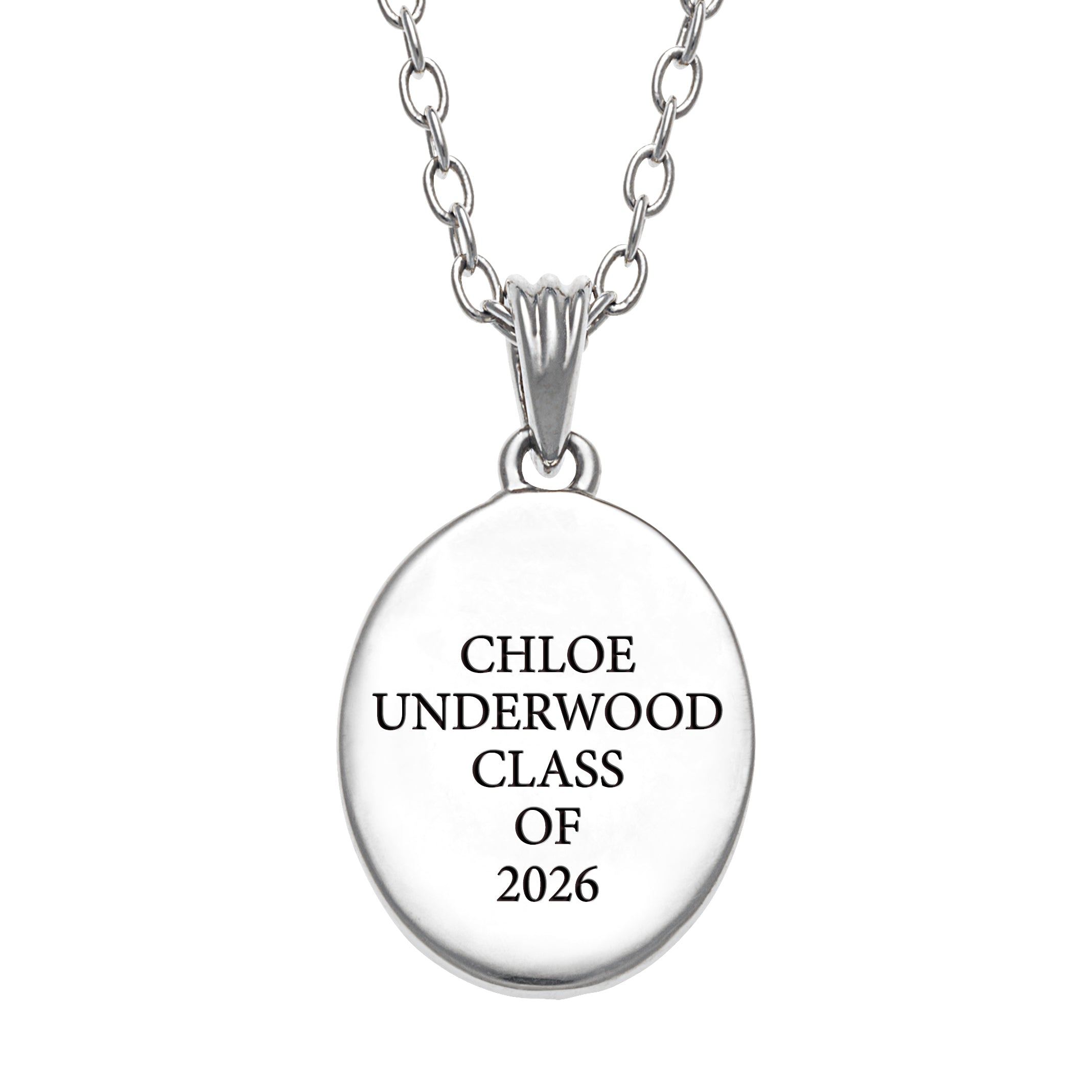 Your graduate has worked hard and deserves a special gift to commemorate their achievements and all of the wonderful memories made. Watch their face light up as they unwrap this beautiful Rhodium-Plated oval pendant, engraved with their name, high school and graduation year.