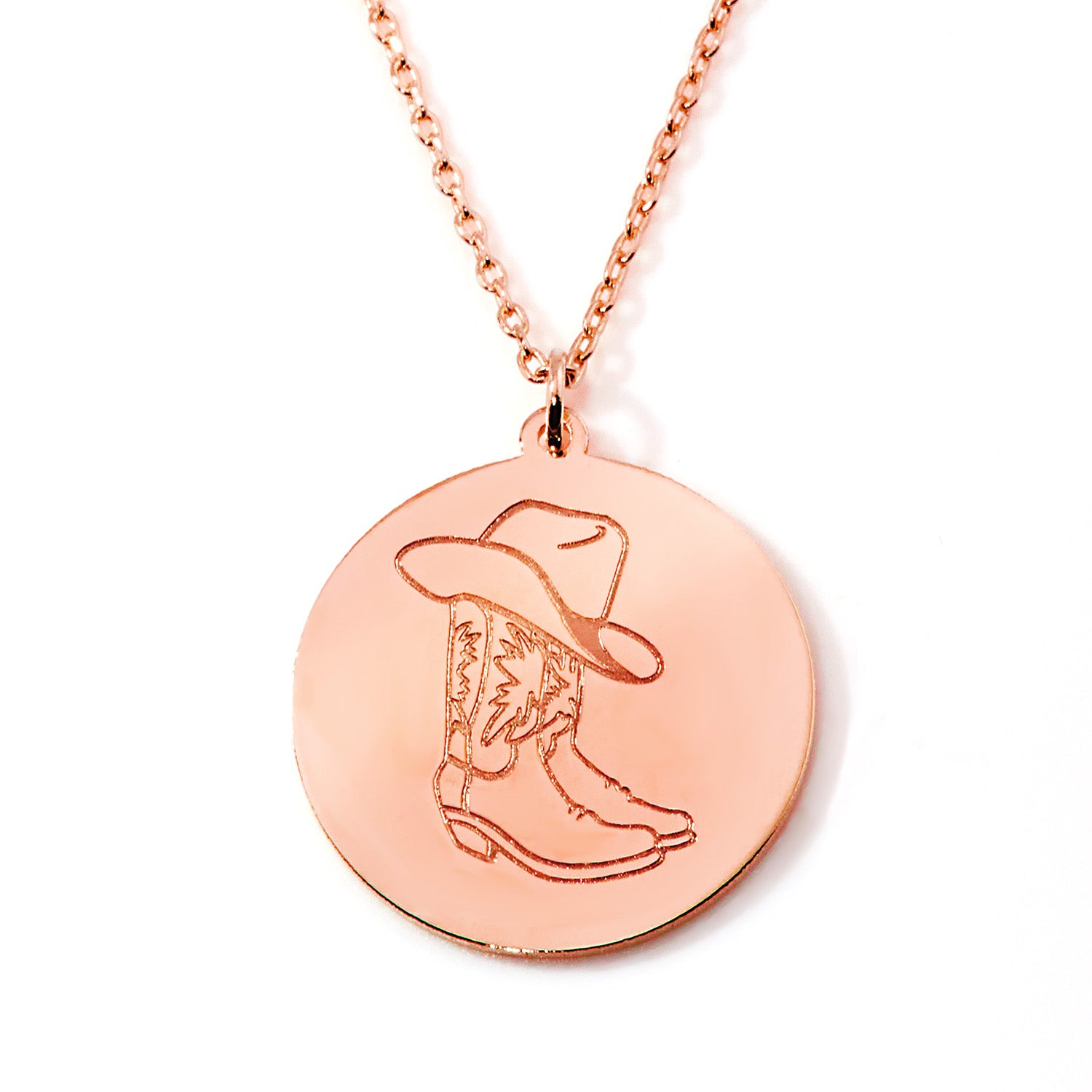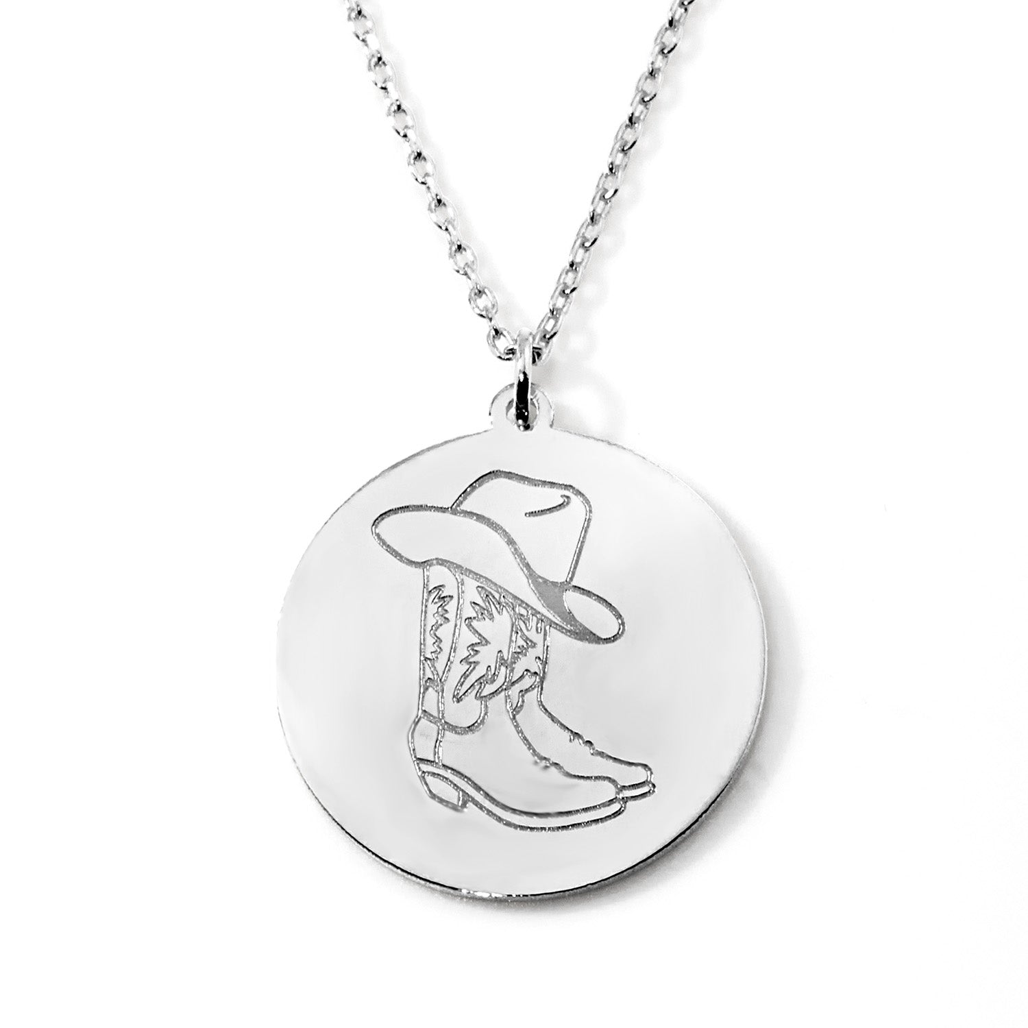 Western charm meets meaningful personalization in this reversible cowboy hat and boot disc necklace. One side features an engraved cowboy hat and boot for a classic country look, while the reverse side is customized with your chosen text in an elegant scriptÑfinished with a sparkling crystal birthstone. Designed to be worn either way, this piece gives you two beautiful looks in one timeless necklace.