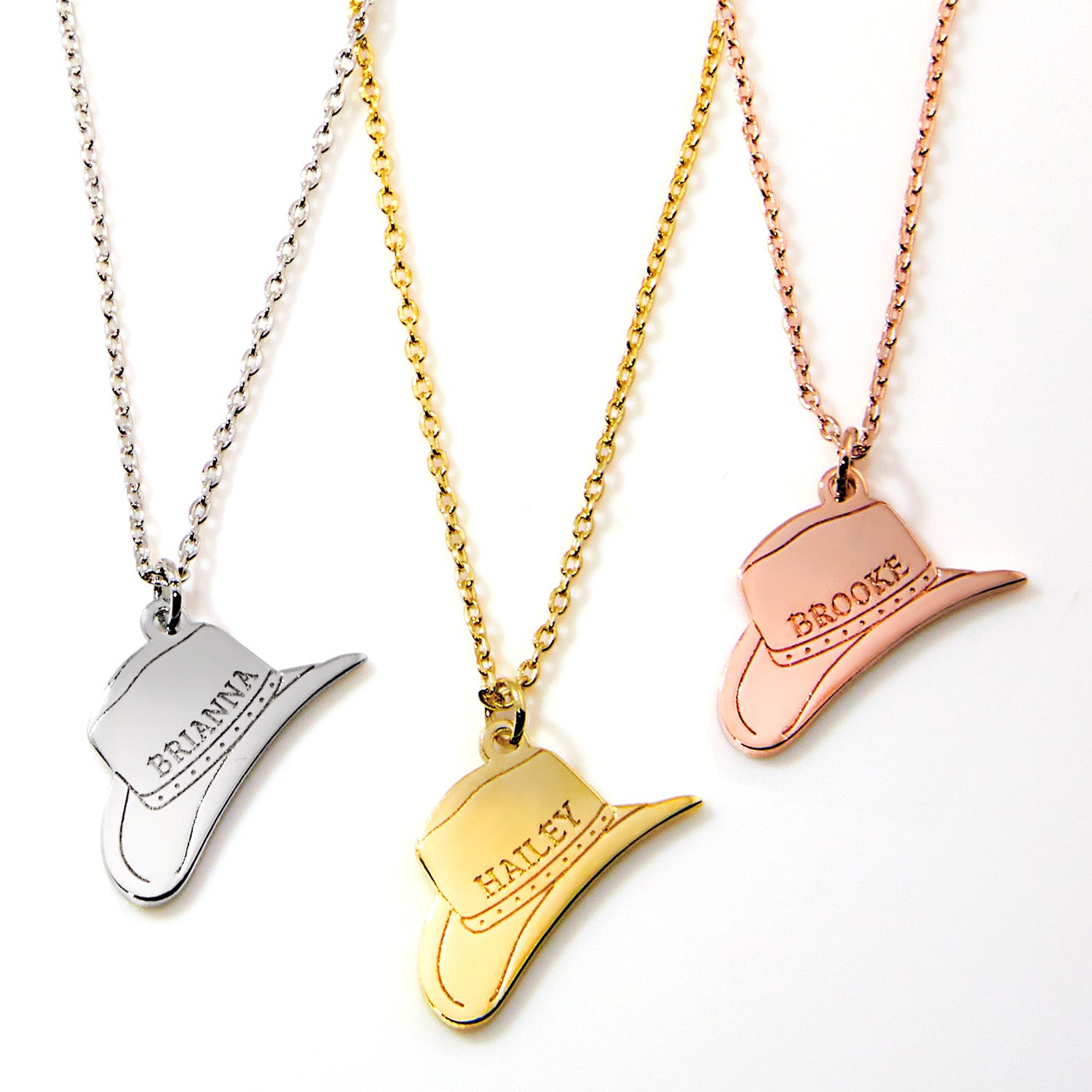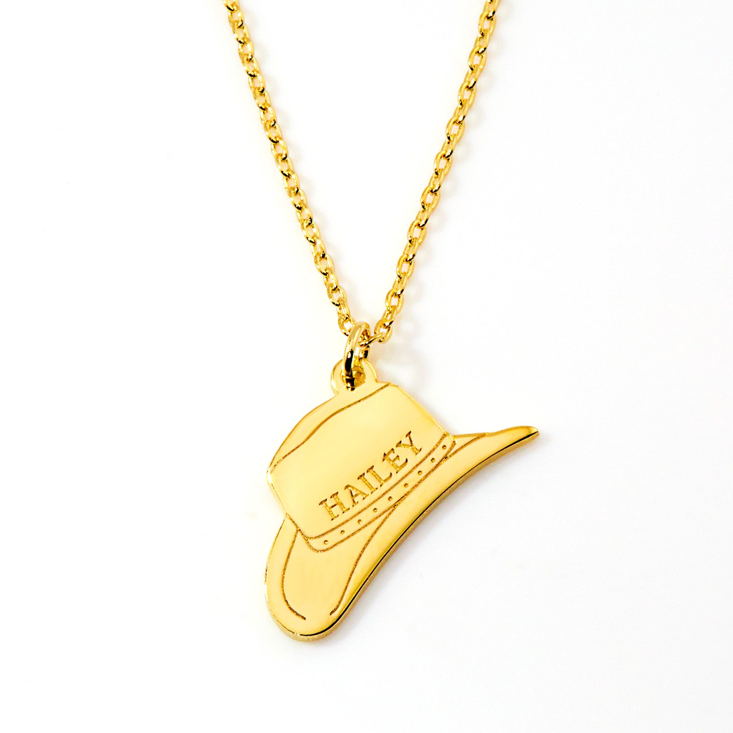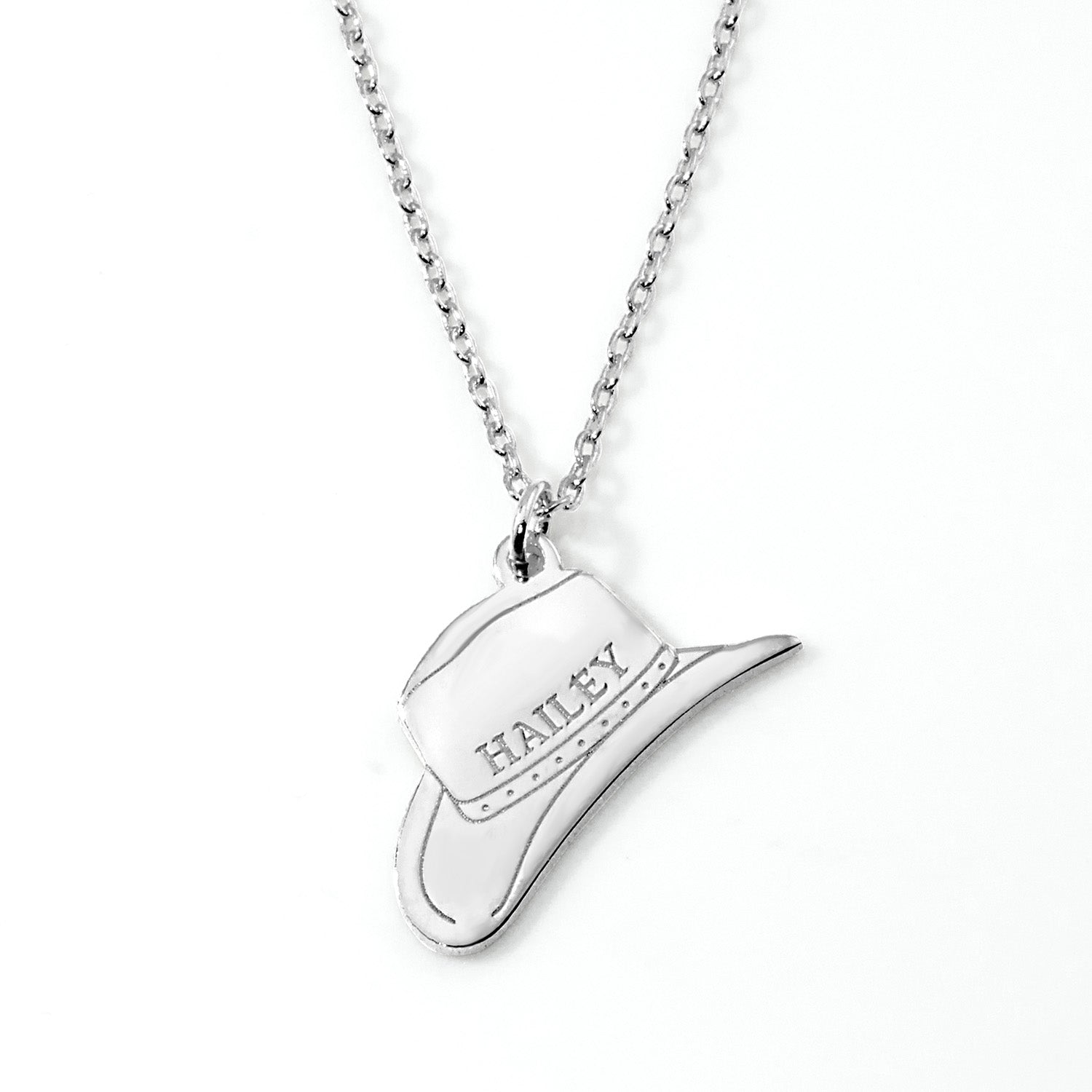Add a touch of western charm to your jewelry collection with this personalized cowboy hat pendant necklace. Designed with a classic silhouette and a decorative hatband detail beneath the engraving, this piece blends rustic style with meaningful personalization. Whether it's a name, initials, or a special word, this necklace is a subtle statement with big personality.