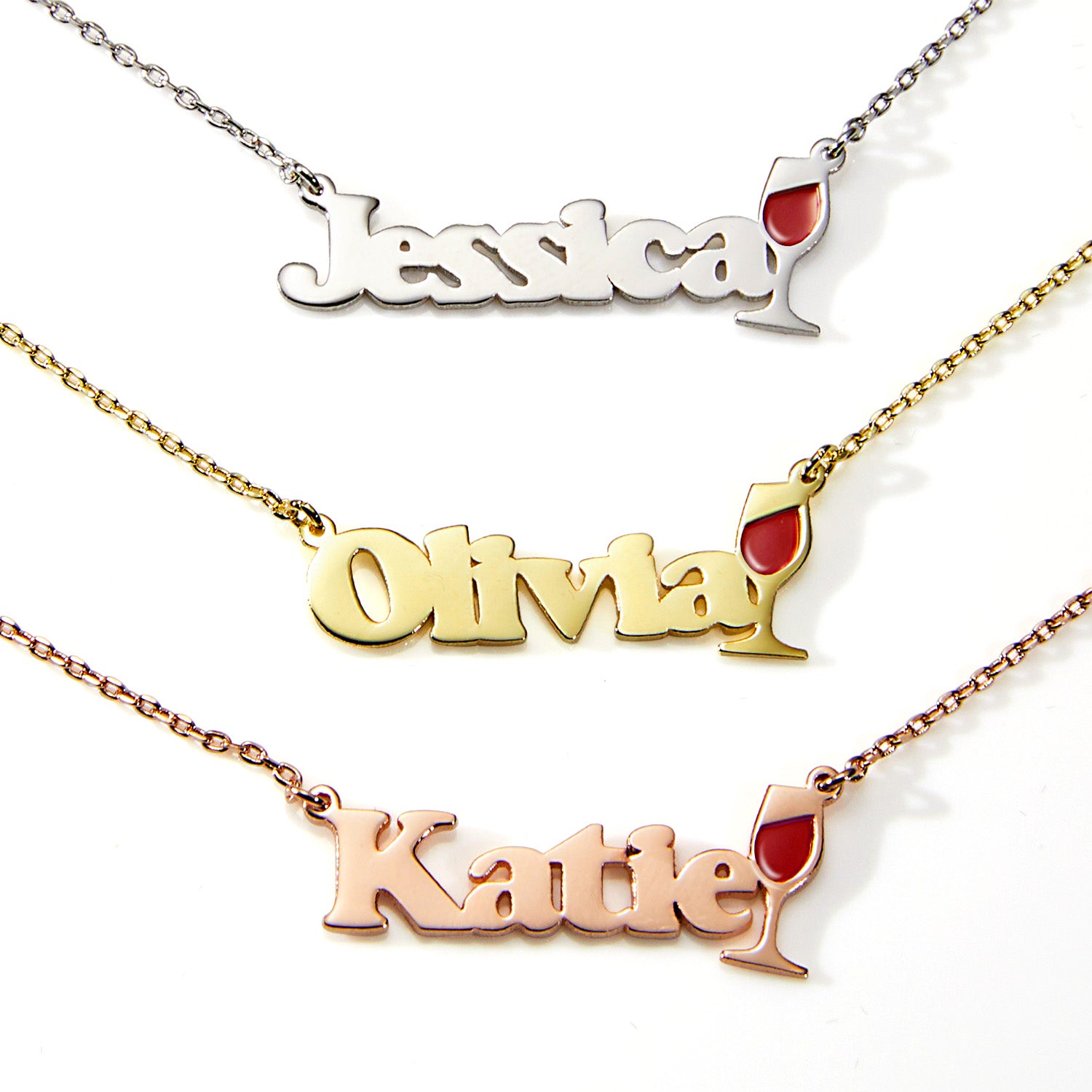 Customize your necklace with a name or favorite word, paired with a wine glass finished in rich merlot-toned, deep ruby enamel. Available in silver, gold, or rose gold plating, each necklace is made to order and uniquely sized based on your personalization.