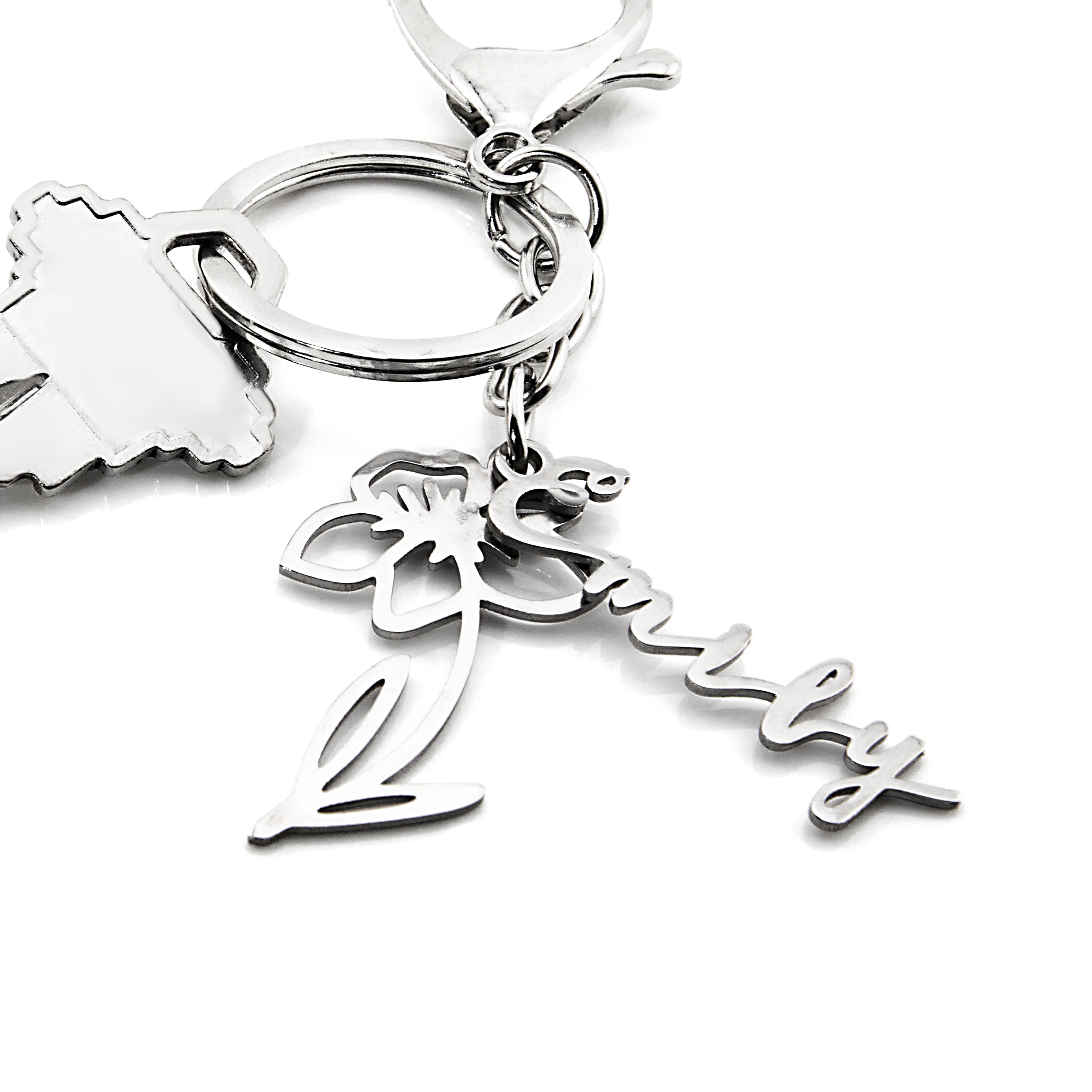 Silvertone and Stainless Steel Script Name and Birth Month Flower Keychain