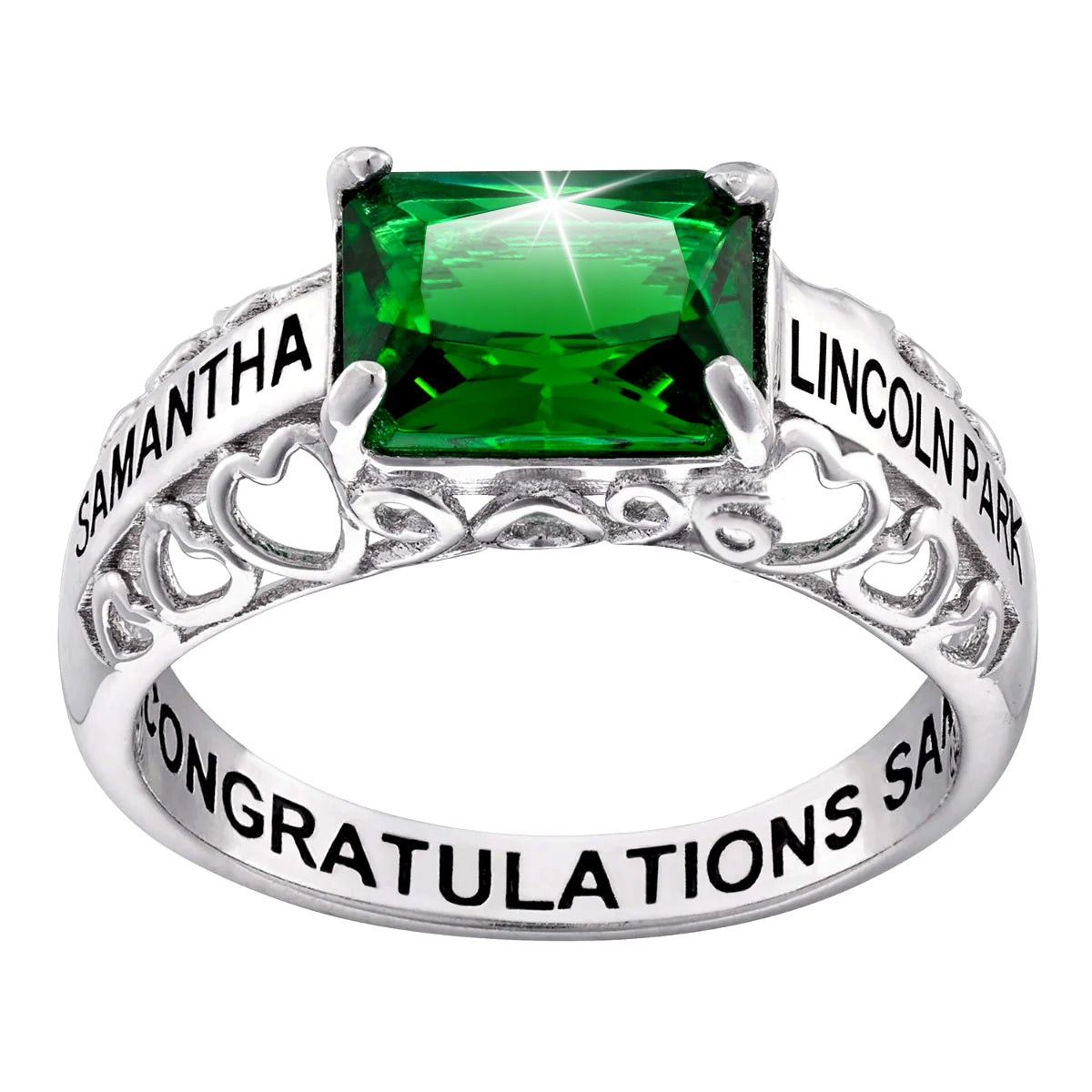 The friends she made, the lessons she learned, the memories she created...help her keep them close with a personalized class ring. Featuring an emerald-cut birthstone, this Sterling Silver ring is the perfect way to commemorate her years as a student. Add an inside message (up to 26 characters) and details on both sides (up to 12 characters each) for a gift she'll treasure forever. The year is incorporated into the intricate filigree design.