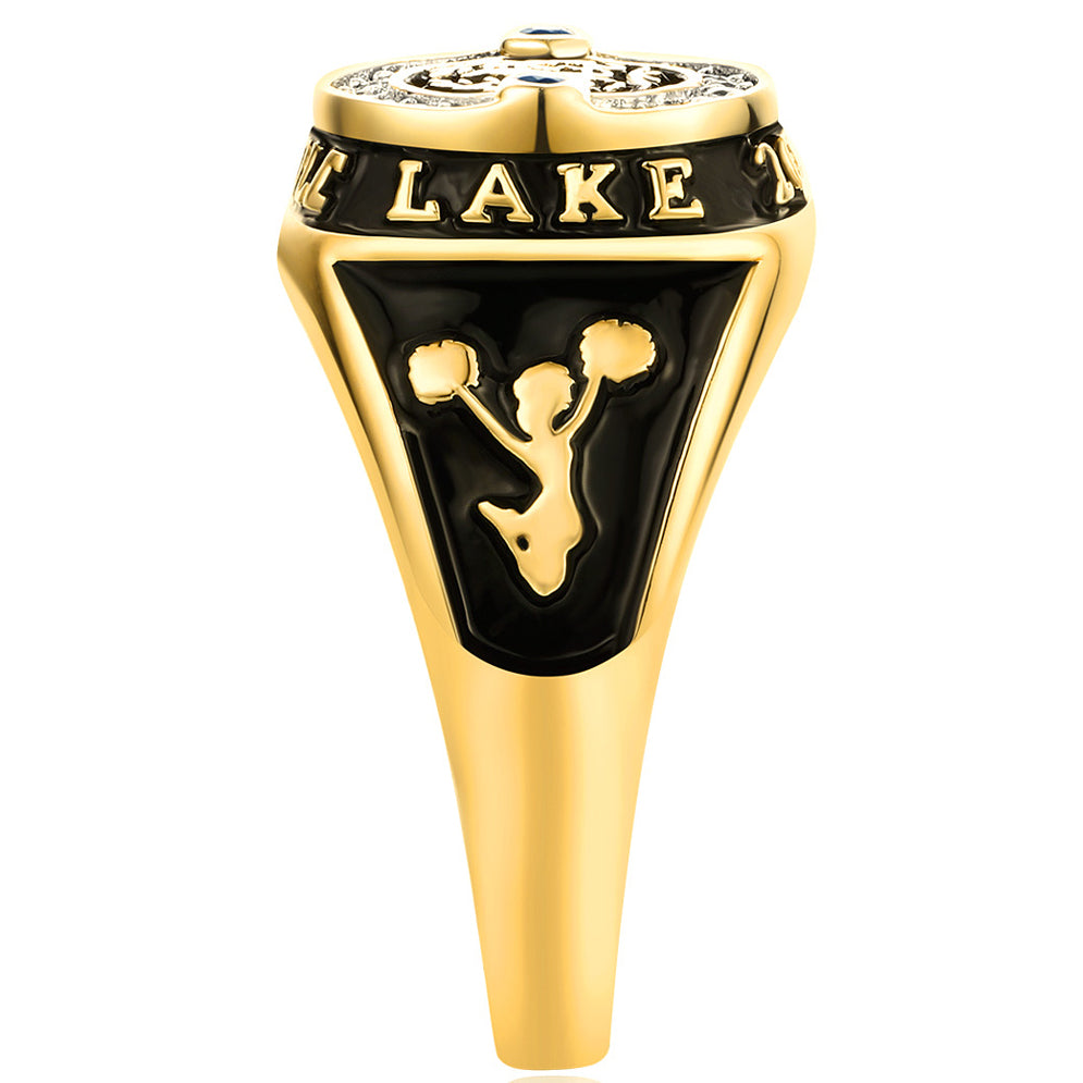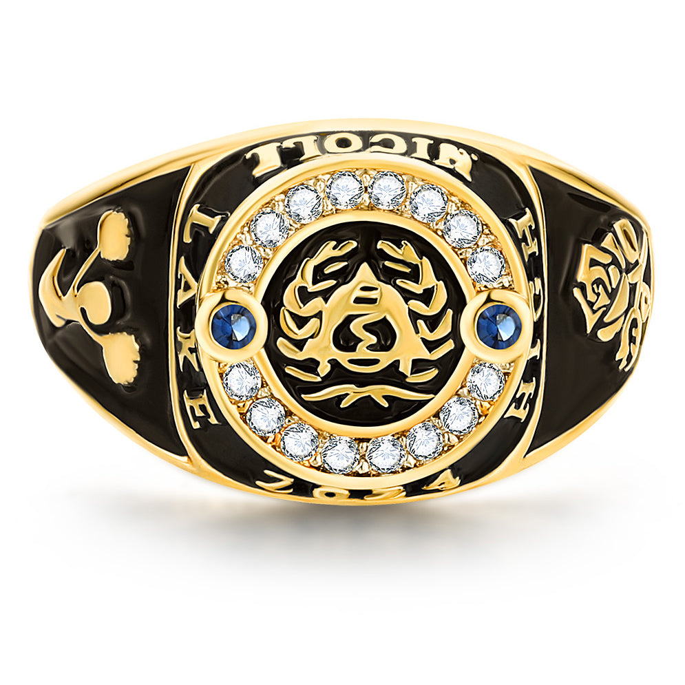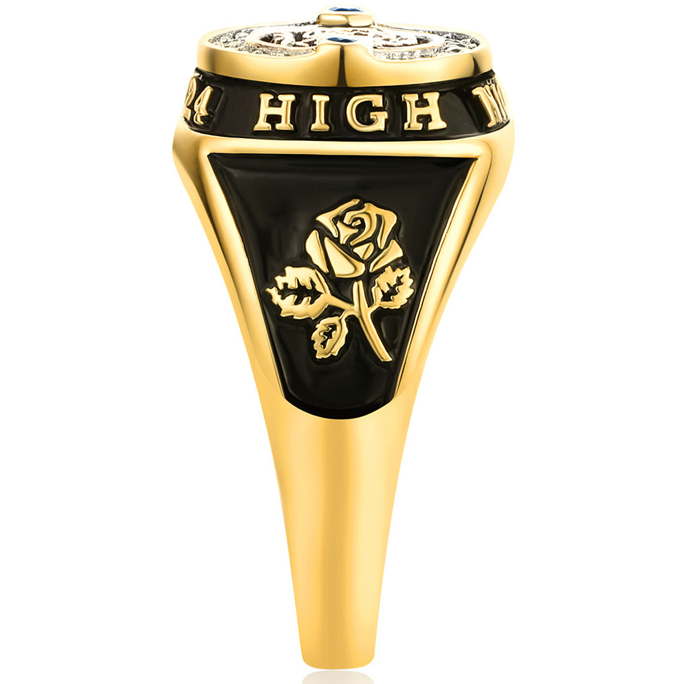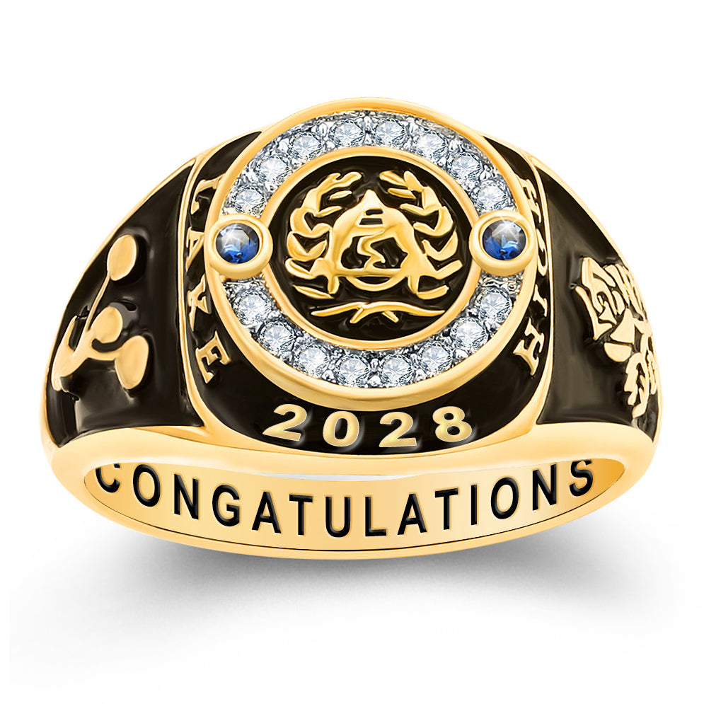 Your senior year and this fashionable class ring are a winning combination! Designed with the look of a sports championship ring in mind, this stunning piece features bold graphics and dazzling CZ accents. Customize with teams, clubs and personal interests to make this Gold plated ring your own.